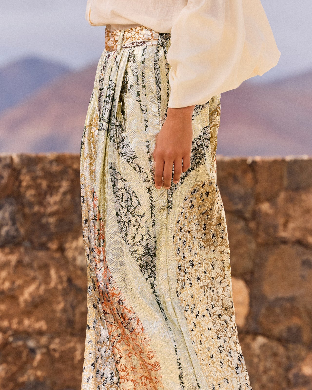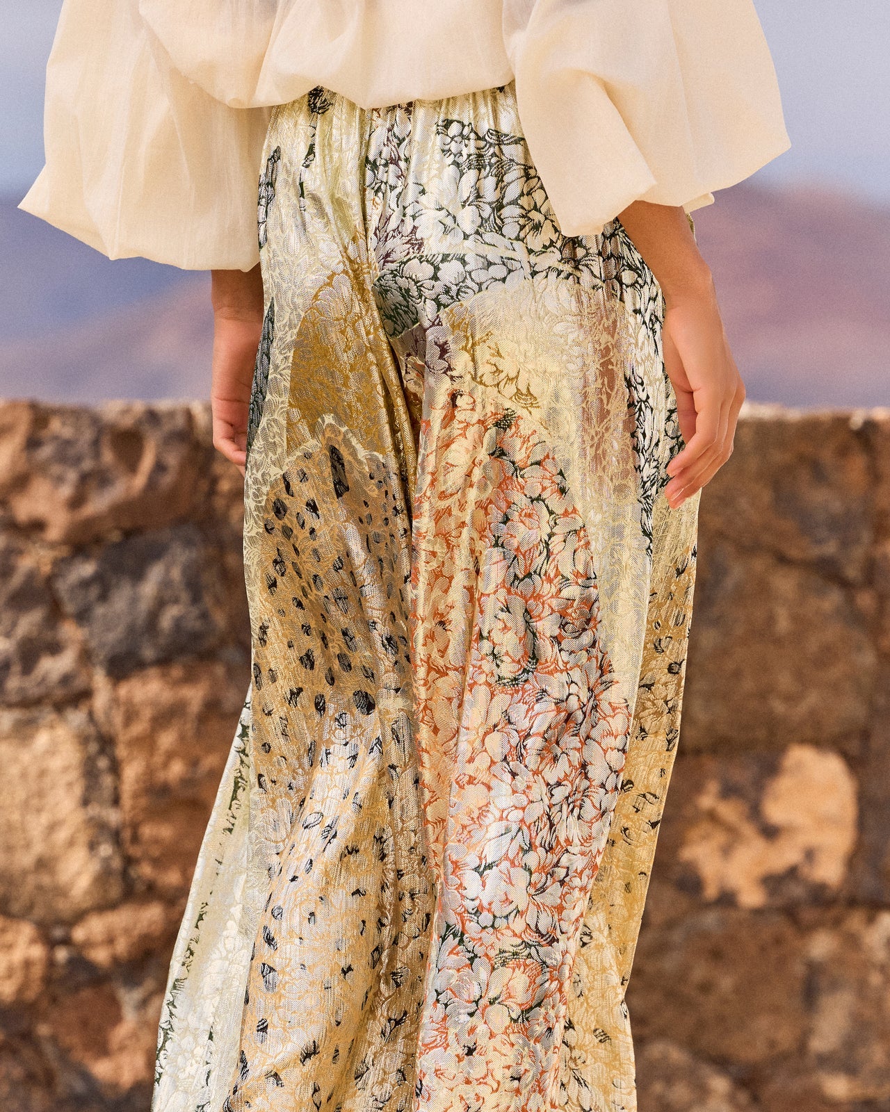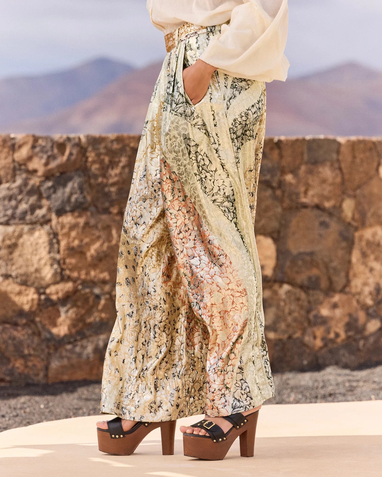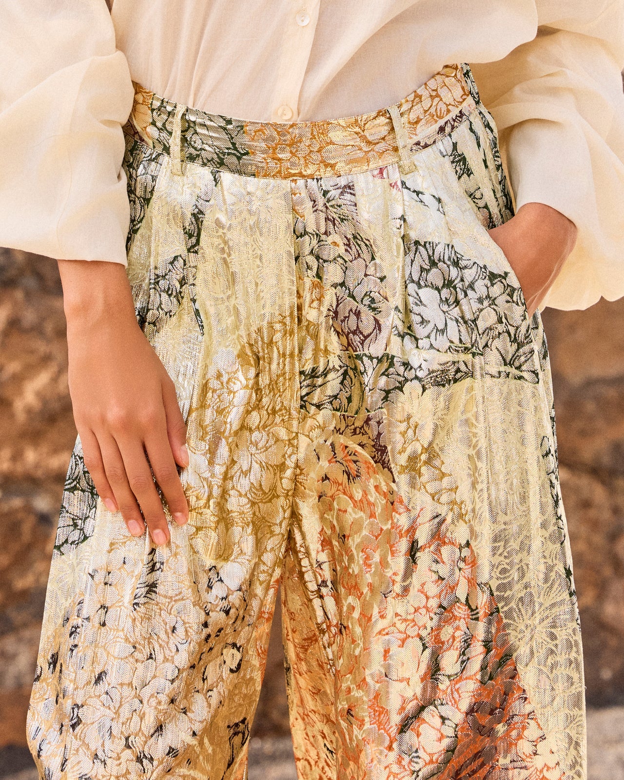 Wide-leg trousers in metallic lurex jacquard with a multicolored placed print, shimmering and iridescent for a textured wet-look effect. The fluid, streamlined cut is enhanced by fine vertical topstitching that accentuates the leg length. Featuring side pockets, belt loops, and a lining in the upper part, they combine comfort and sophistication. A style with a soft, luminous drape, perfect for pairing with the matching shirt in the same fabric.