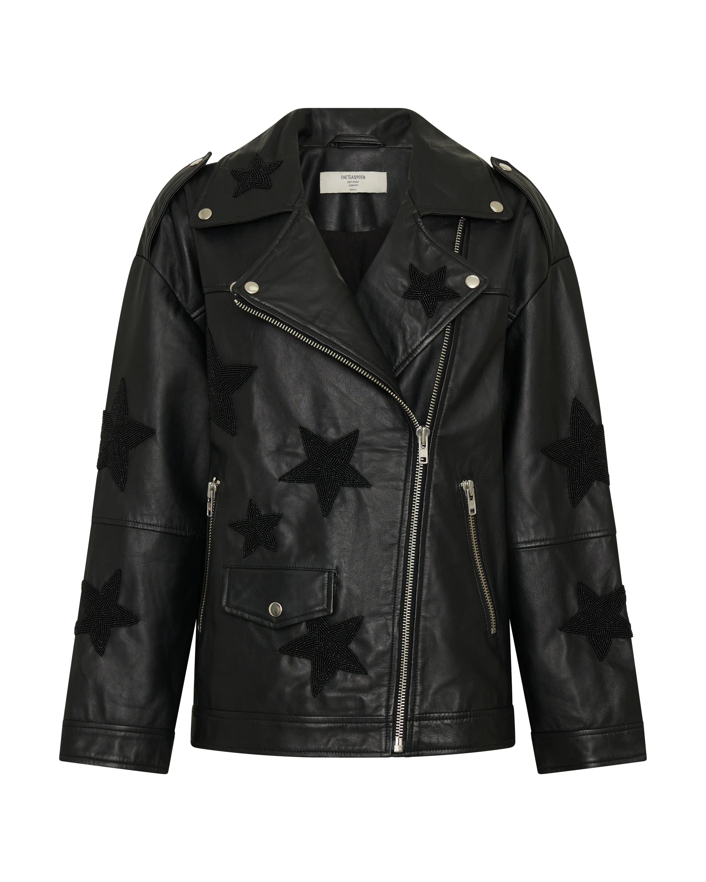 Bold, rebellious, and built to shine. The BLACK STAR BIKER BOYFRIEND EMBELLISHED MOTO LEATHER JACKET fuses iconic moto styling with serious attitude. With a boyfriend fit, hand-beaded star embellishments, and a tough, oversized silhouette, this jacket is made to make a statement. Fully lined with silver-toned hardware and zipped cuffs, it's a heavyweight hero in any cool-weather lineup.