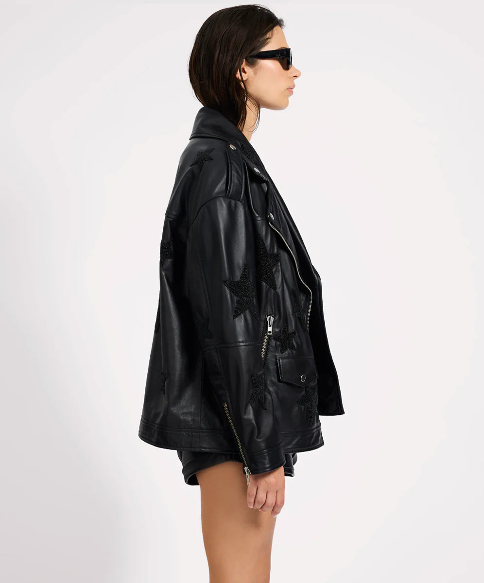 Throw it on over a slinky slip dress, or pair it with relaxed denim jeans and boots for an effortless street look. The BLACK STAR is a standout layer that levels up any outfit — edgy enough for after-dark adventures and bold enough for everyday attitude. Also fits right in with our full lineup of jackets and outerwear.