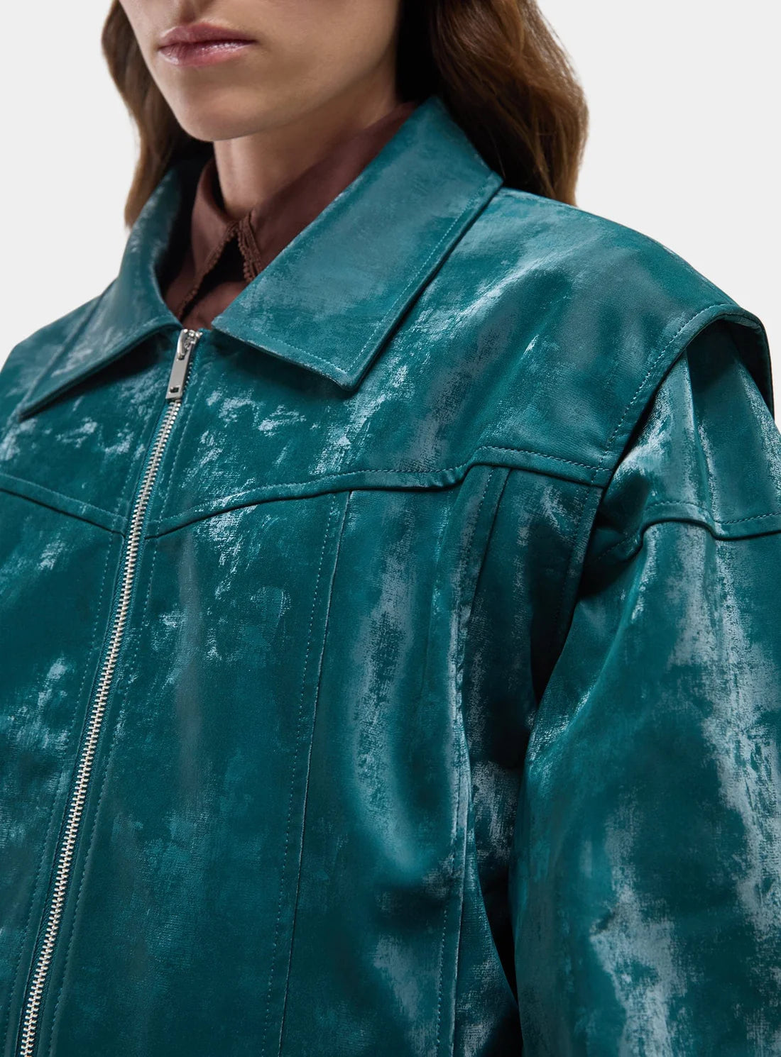 Textured bomber jacket featuring a lapel collar and puffed long sleeves. Front and back yokes with stitchings. Side pockets. Long wide sleeves gathered in cuff pieces. Black Lining. Front metal zipper fastening with sides on tone.