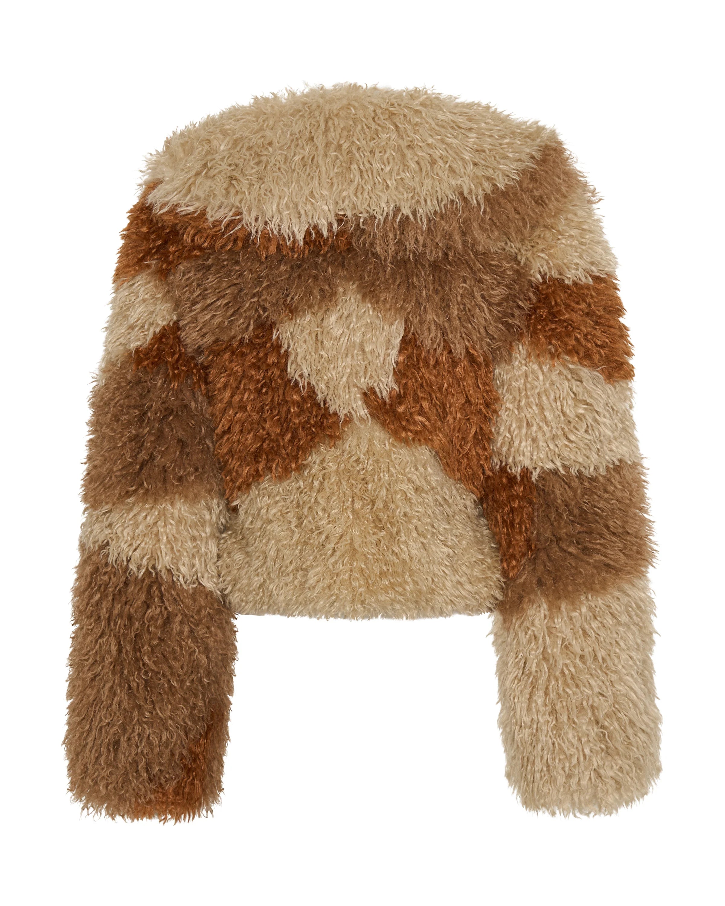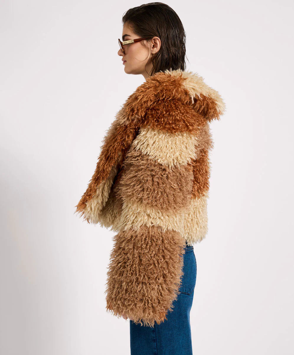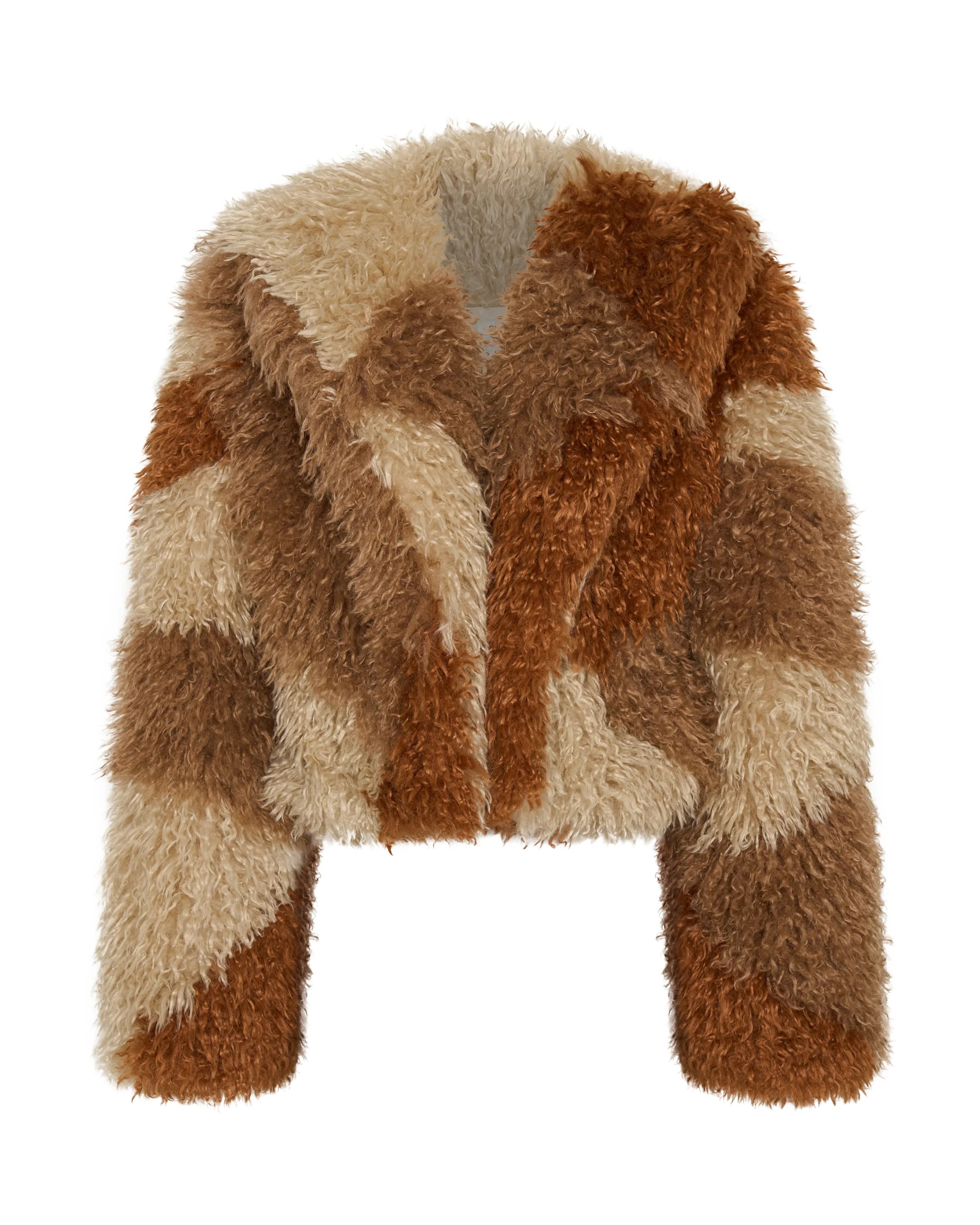 The Tan Mongolian Cropped Faux Fur Jacket brings high drama with zero effort. Fluffy, tactile, and totally statement-making, this shawl-style jacket is crafted from voluminous faux fur in a mix of warm tans. A cropped silhouette and oversized collar add extra flair, while hidden hook and eye closures keep things chic and clean-lined.