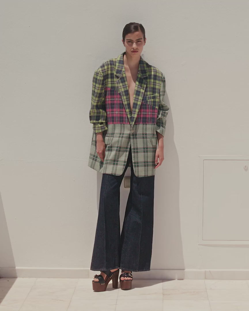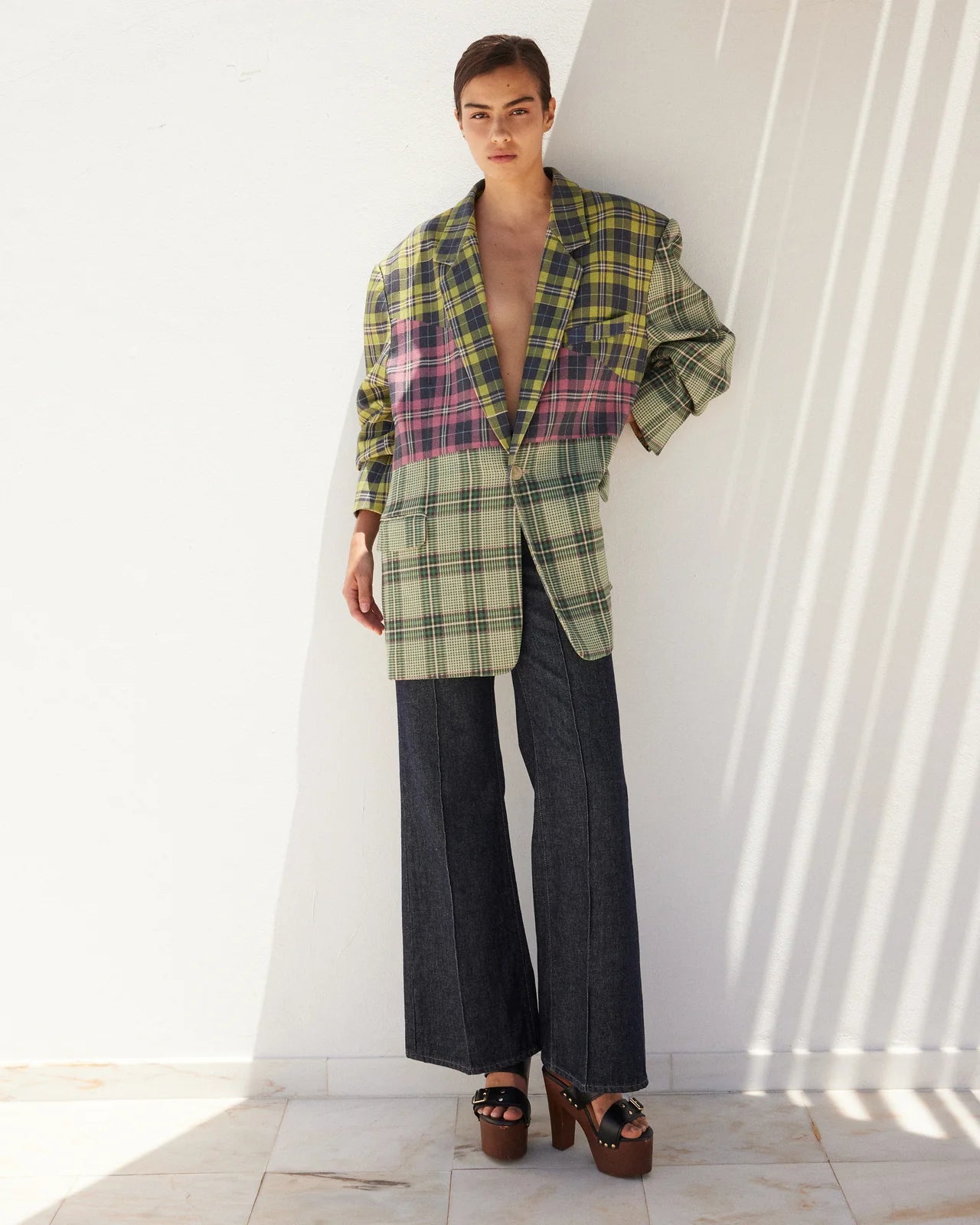 Jacket crafted from multicolored tartan patches. Its masculine cut, with a pronounced drape on the shoulders, offers a modern and assertive oversized volume. The model is completed with lapel pockets, combining casual style with a contemporary look.