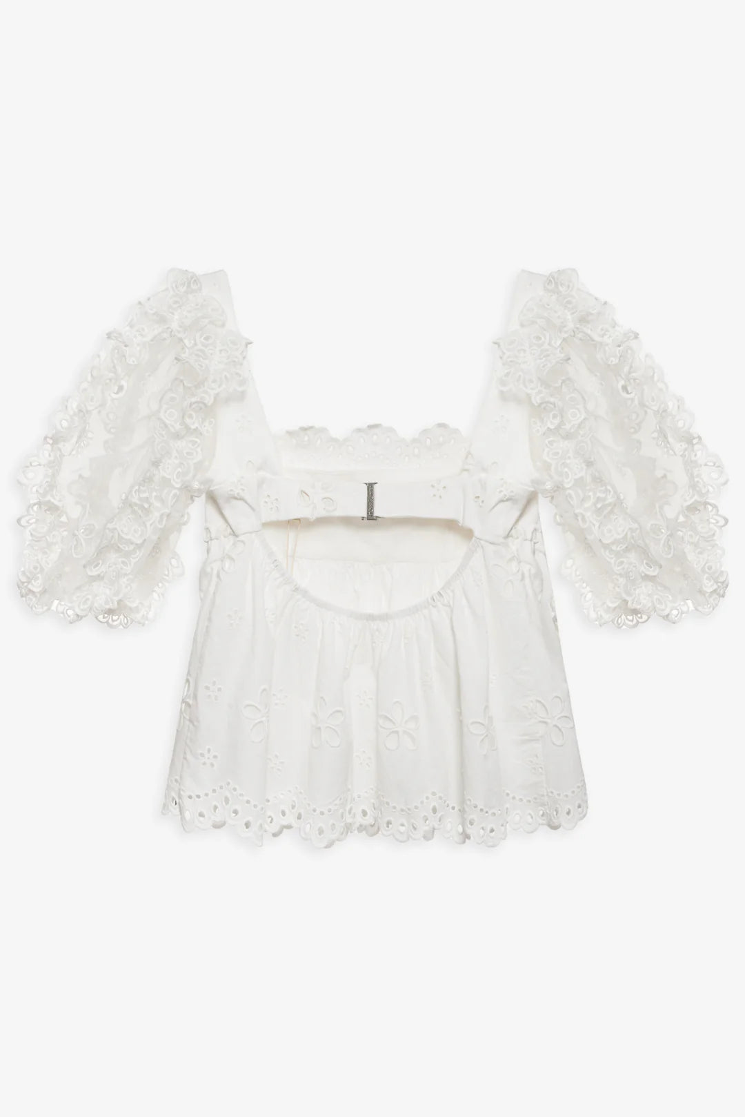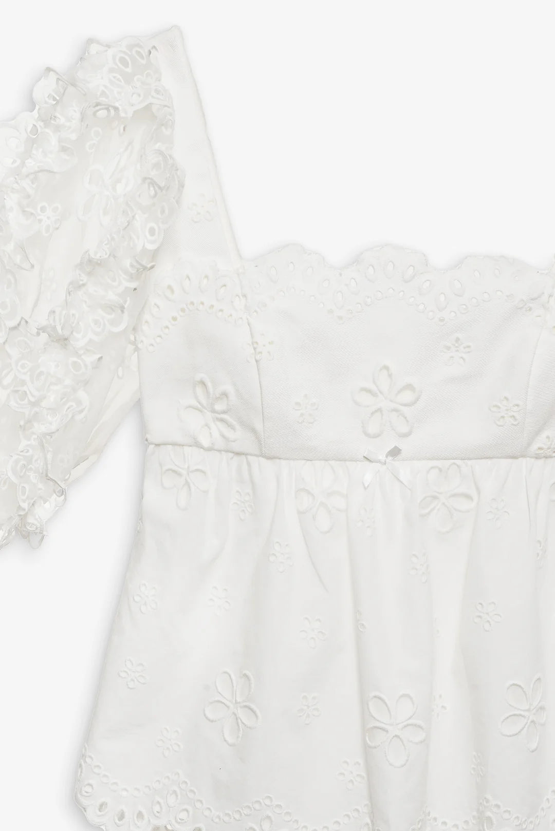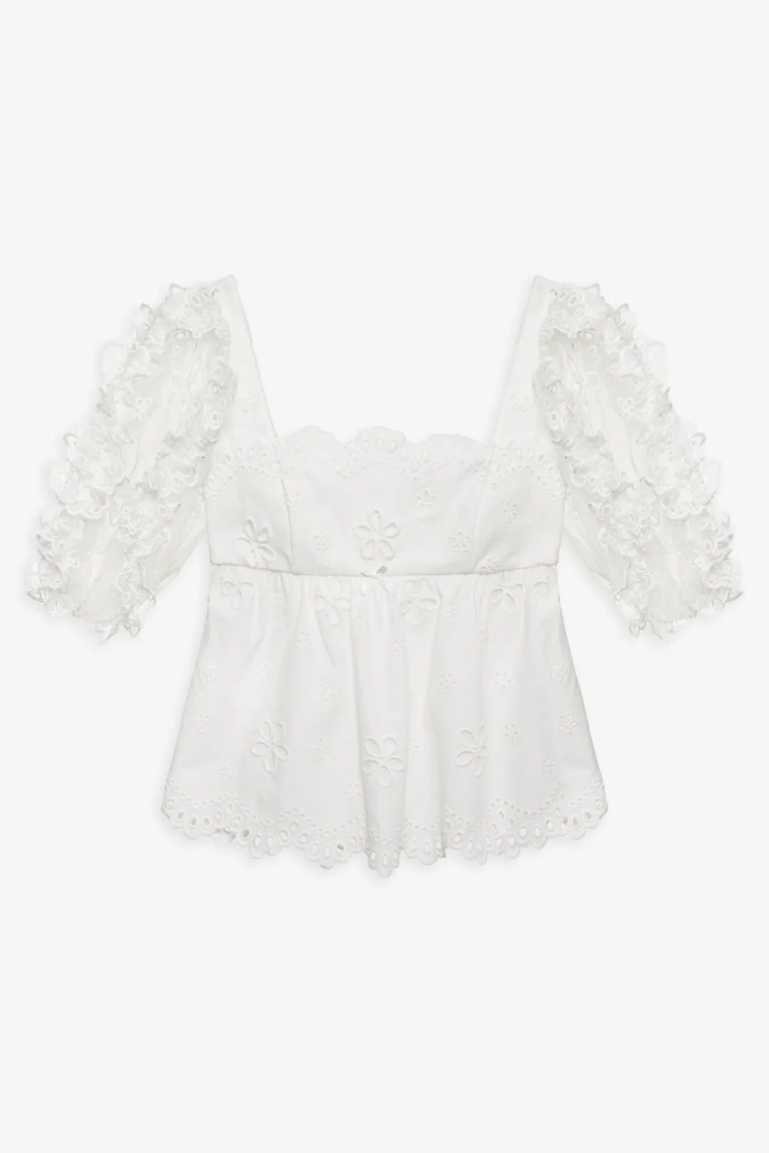 An ultra-feminine babydoll top for springtime strolls, the Daisy eyelet top is crafted in a crisp daisy eyelet on denim. This white top spotlights a chic scalloped squared neckline, sheer elasticized organza eyelet puff elbow length sleeves, and an open back.