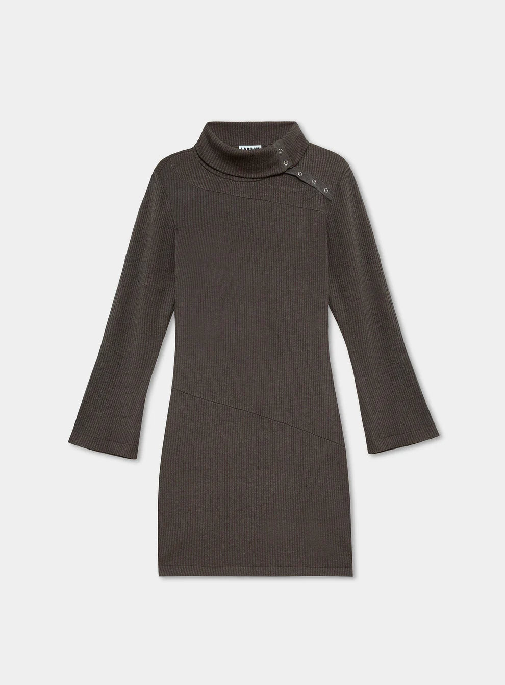 Short dress made in texture jersey fabric. Fitted silhouette with long sleeves. Double neck with metallic snaps details.