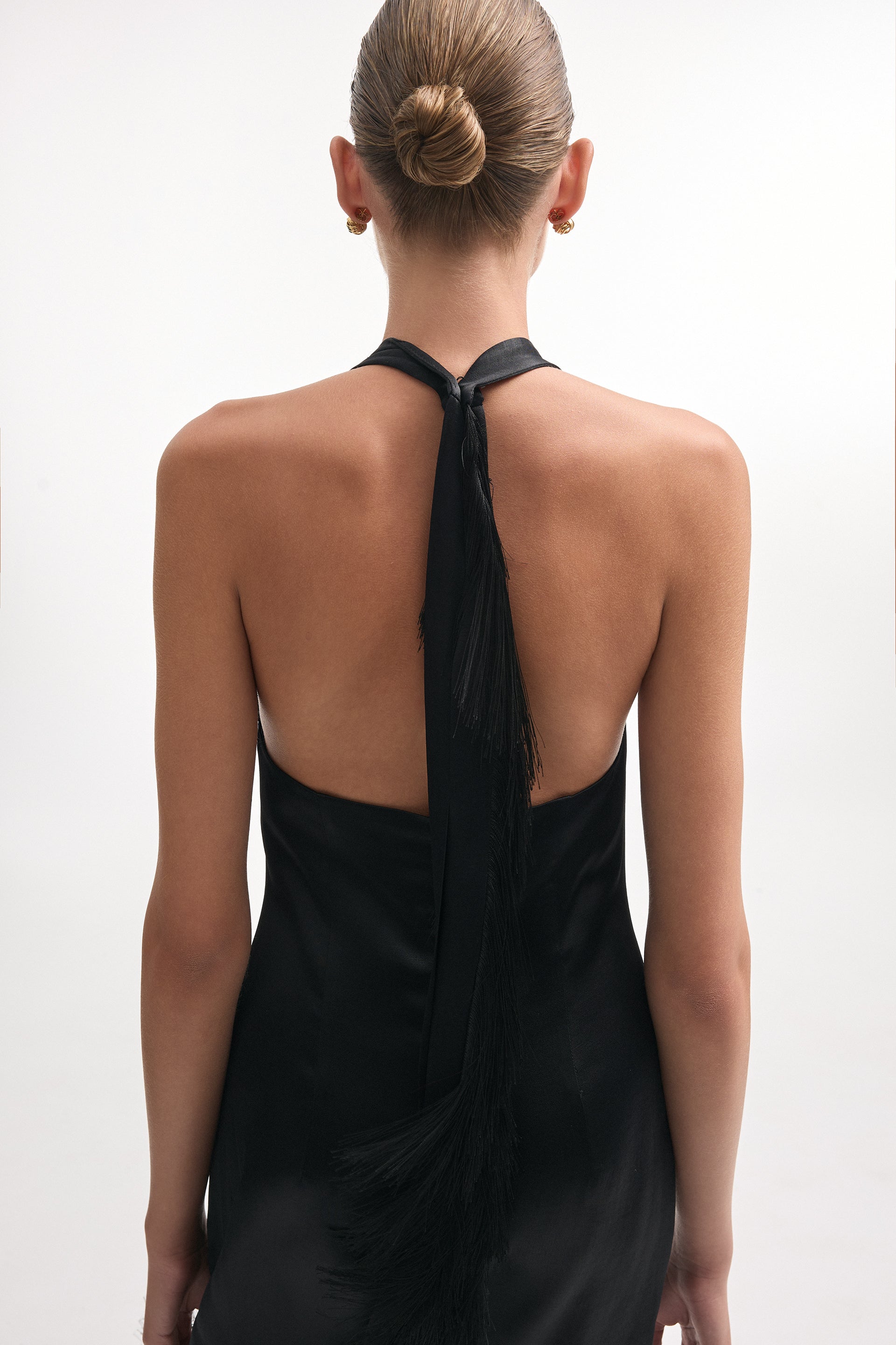 A statement mini dress designed to turn heads. Featuring a deep neckline and a sleek, body-hugging fit, it highlights femininity with elegance. The open back adds a bold touch, while the long fringe details create movement and drama with every step. Perfect for nights out and special occasions.