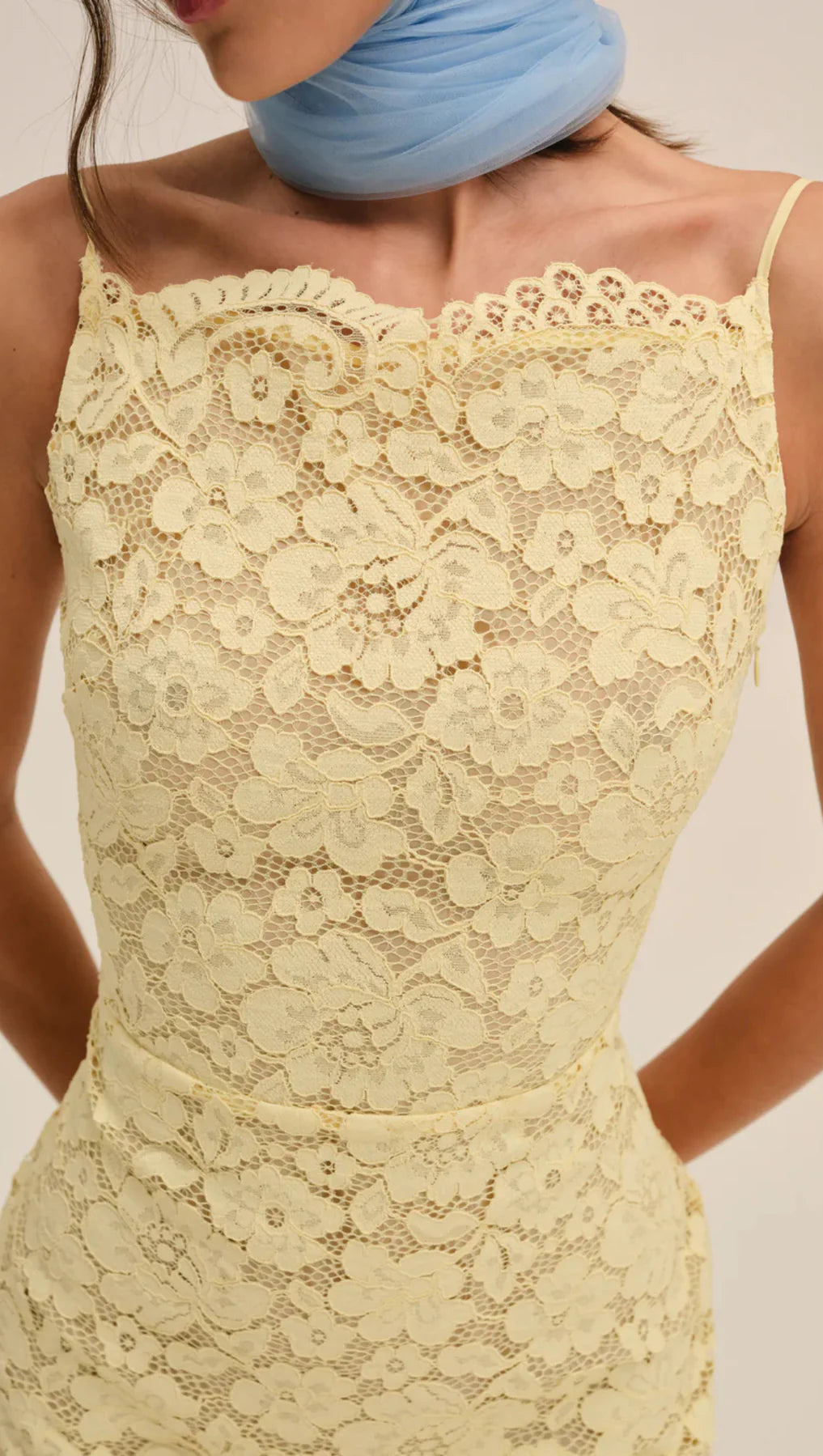 Perfect for summer soirées, the Lakeside mini dress takes references from effortless '90s silhouettes. This lace mini dress spotlights a high neckline, an open "V"-shaped back, and scalloped lace edges.