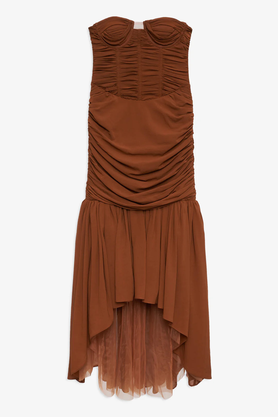 FOR LOVE & LEMONS KEEPSAKES: Designed for the Muse who indulges in romance, the Serafina brown gown captivates and charms with its strapless bodycon silhouette that flares at the mid-thigh. Crafted in a luxurious silk chiffon, this evening gown features ruched underwire cups, a corset bodice, and an alluring high-low hem.