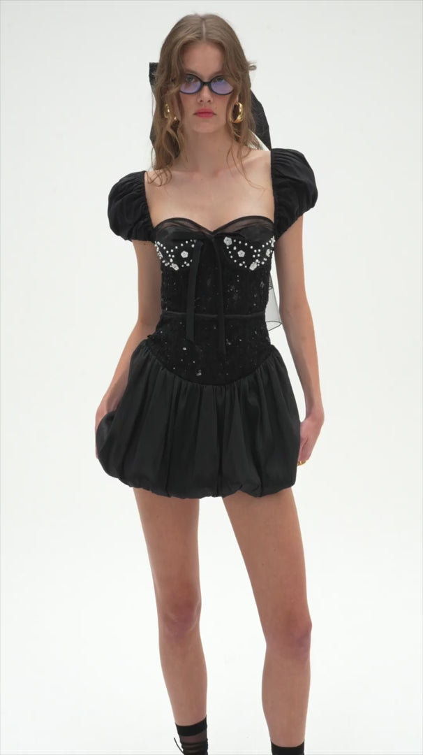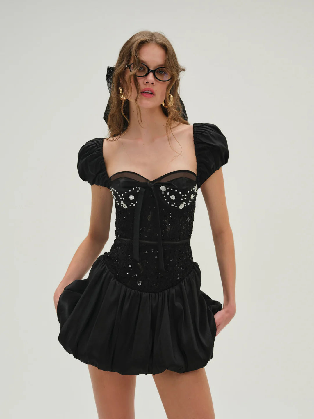 Designed for your most dazzling parties, the McKenna little black dress is crafted in taffeta with corded lace, and sequins and beaded embellishments at the cups. This black mini dress also spotlights a fixed bow, short puff sleeves, and the silhouette of the season: the oh-so-playful puff skirt.