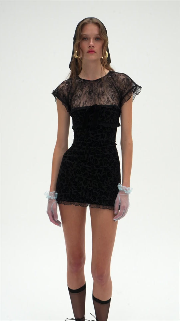 The Midnight black mini dress is the perfect LBD for winter parties. Crafted in a burnout velvet with a contrast lace shirred neckline and sleeve panel, this little black dress is cut to an empire waist and features a ruffled trim and a velvet black bow.