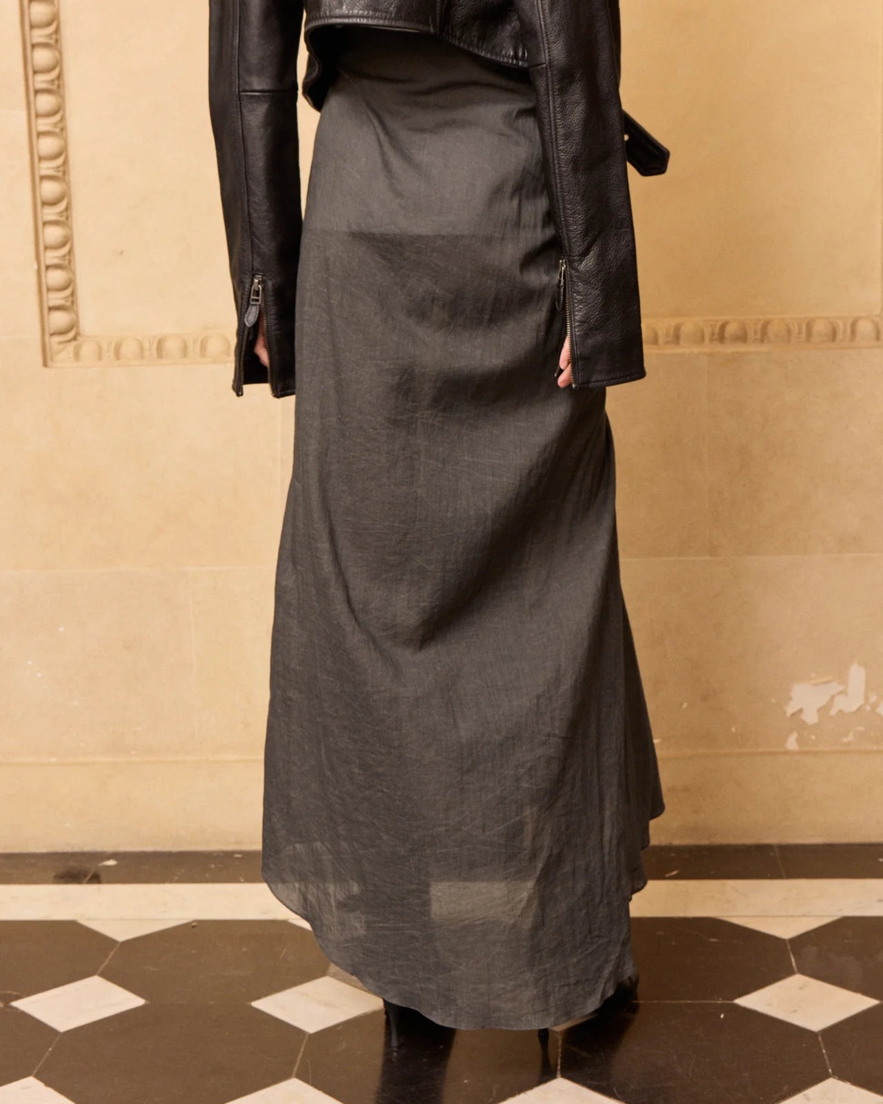 Pigment-dyed cotton midi skirt with an elegant, structured straight cut. Pleats at the front create a draped flounce, adding volume and movement to the silhouette. The invisible back zipper ensures a clean, modern finish. A piece with a simple, architectural style, perfect for a contemporary and sophisticated look.