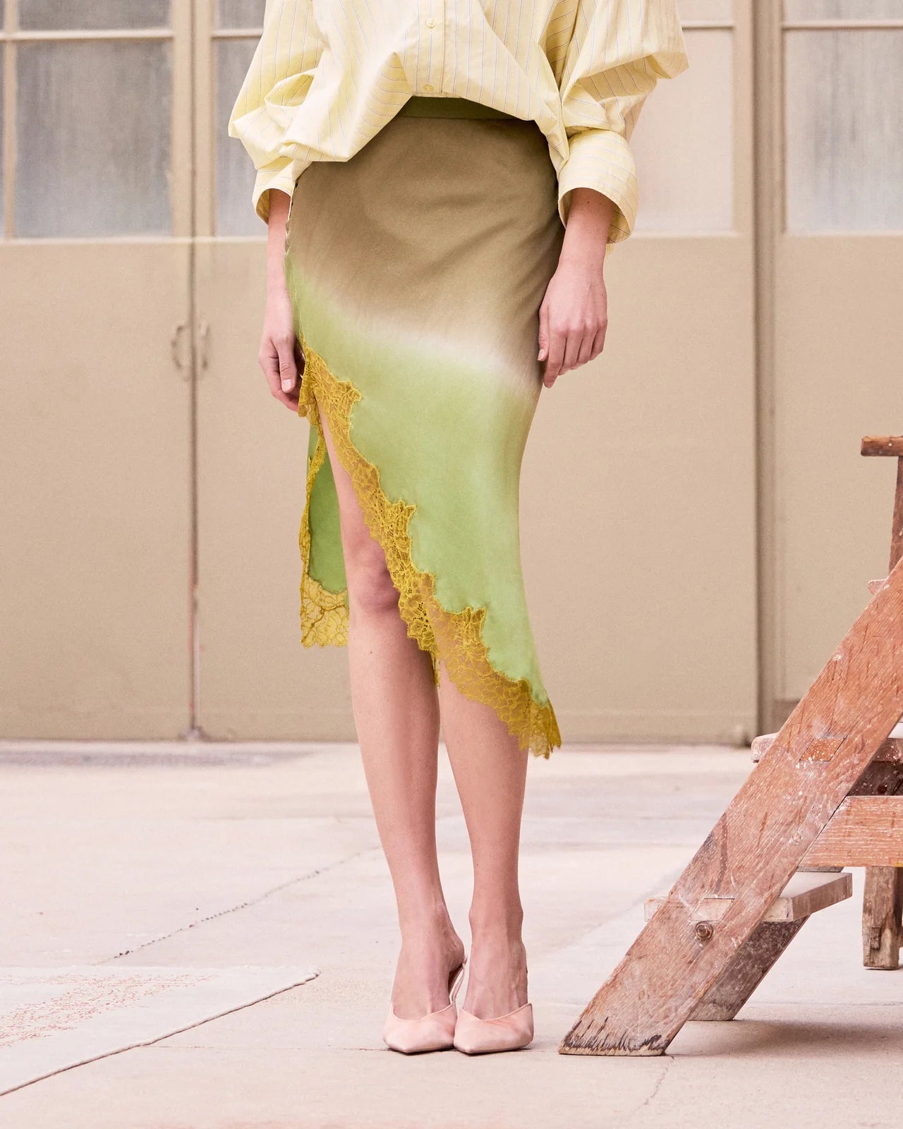 A flowing, mid-length skirt in sand-washed satin silk, with a subtly soft, peach-skin feel.