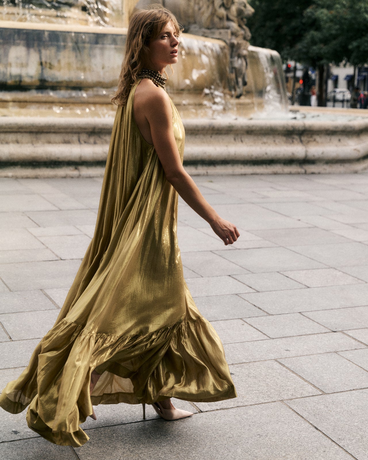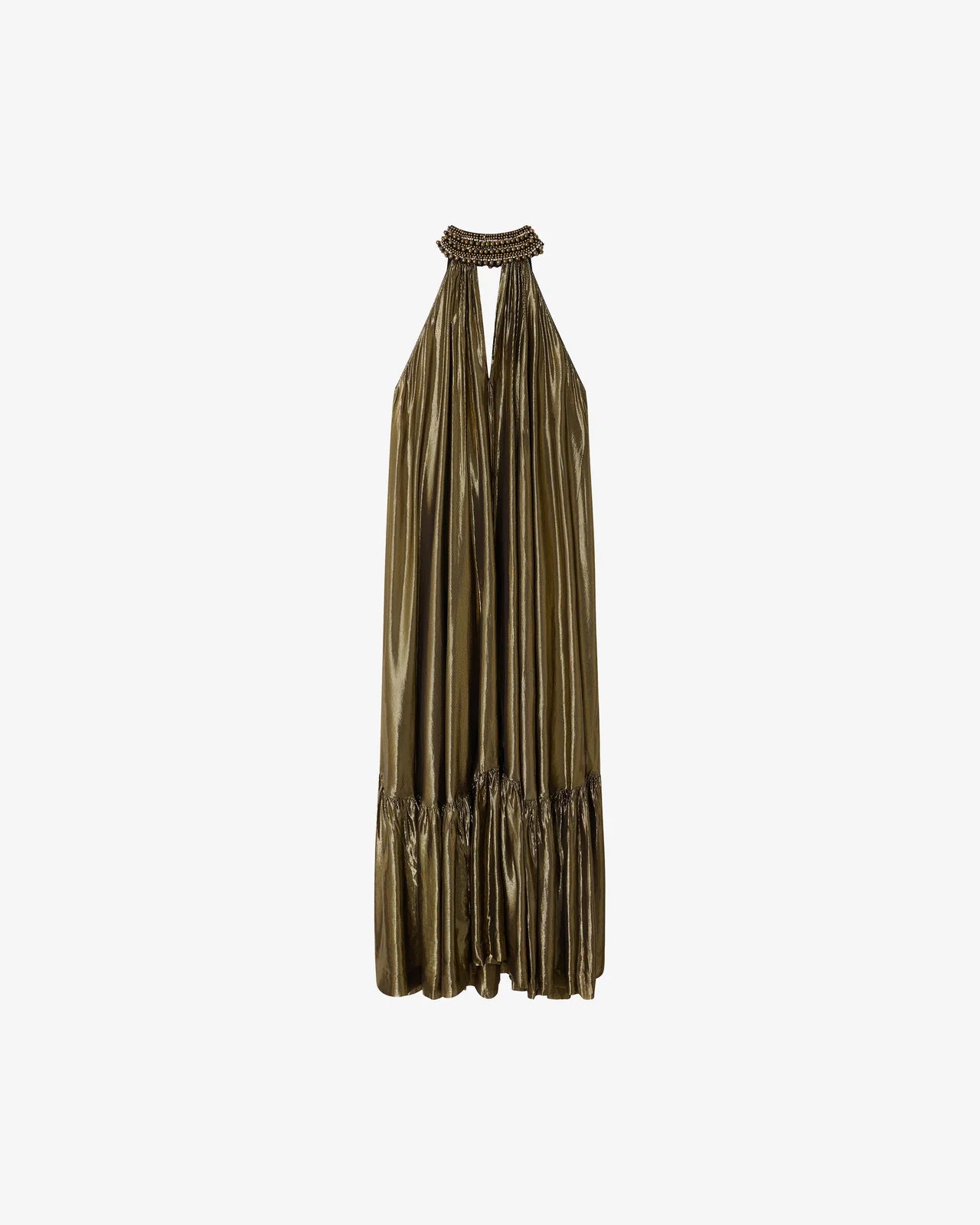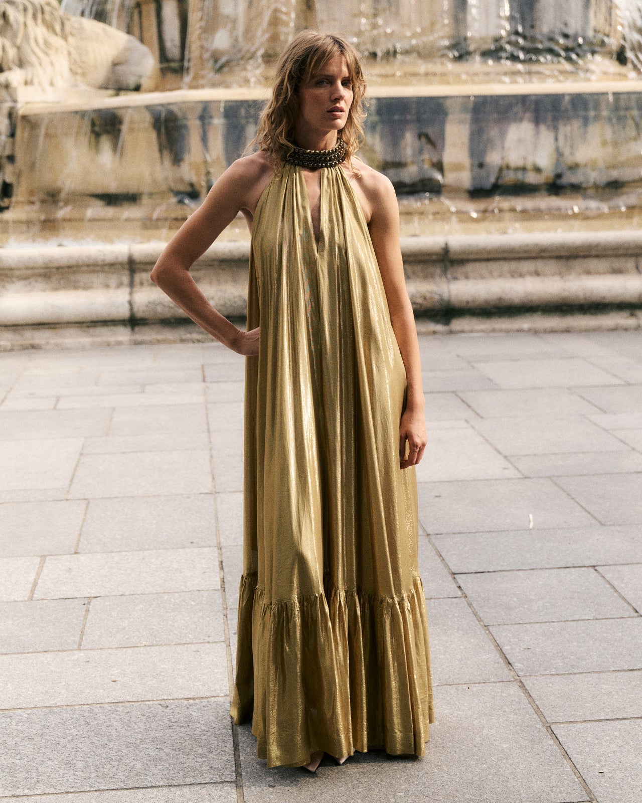 A majestic dress in fluid charcoal viscose, embellished with a gold lurex thread that catches the light with every movement. Its jeweled collar is entirely hand-embroidered with pearls and rhinestones, adding a precious and sophisticated touch. The loose, flowing cut unfolds in a generous volume of fabric, enlivened by gathers and ruffles at the hem for an elegant and airy drape. A lightweight silky modal lining is attached inside, ensuring comfort and opacity while preserving the fabric's fluidity. An exceptional, feminine, and luminous piece, ideal for elegant occasions or summer evenings.