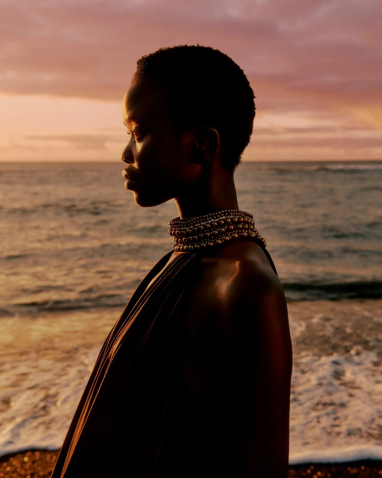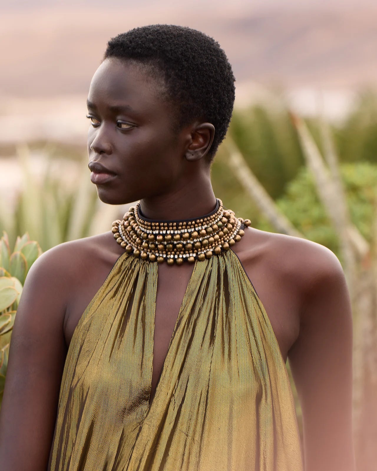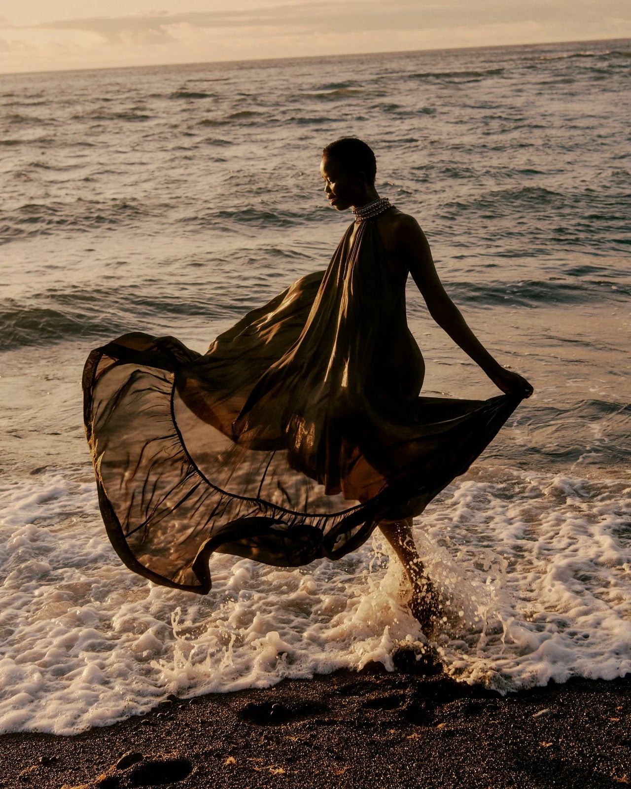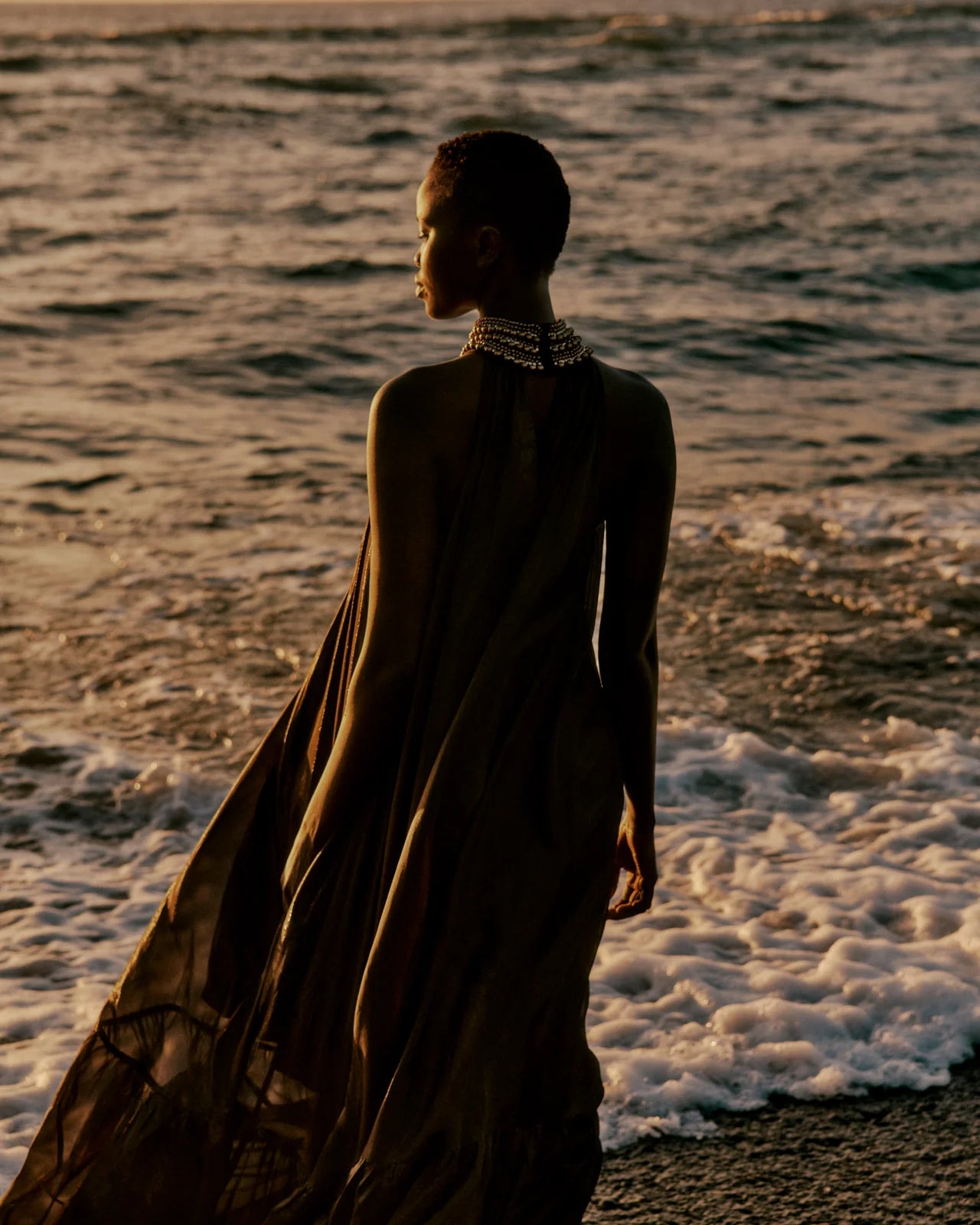 A majestic dress in fluid charcoal viscose, embellished with a gold lurex thread that catches the light with every movement. Its jeweled collar is entirely hand-embroidered with pearls and rhinestones, adding a precious and sophisticated touch. The loose, flowing cut unfolds in a generous volume of fabric, enlivened by gathers and ruffles at the hem for an elegant and airy drape. A lightweight silky modal lining is attached inside, ensuring comfort and opacity while preserving the fabric's fluidity. An exceptional, feminine, and luminous piece, ideal for elegant occasions or summer evenings.