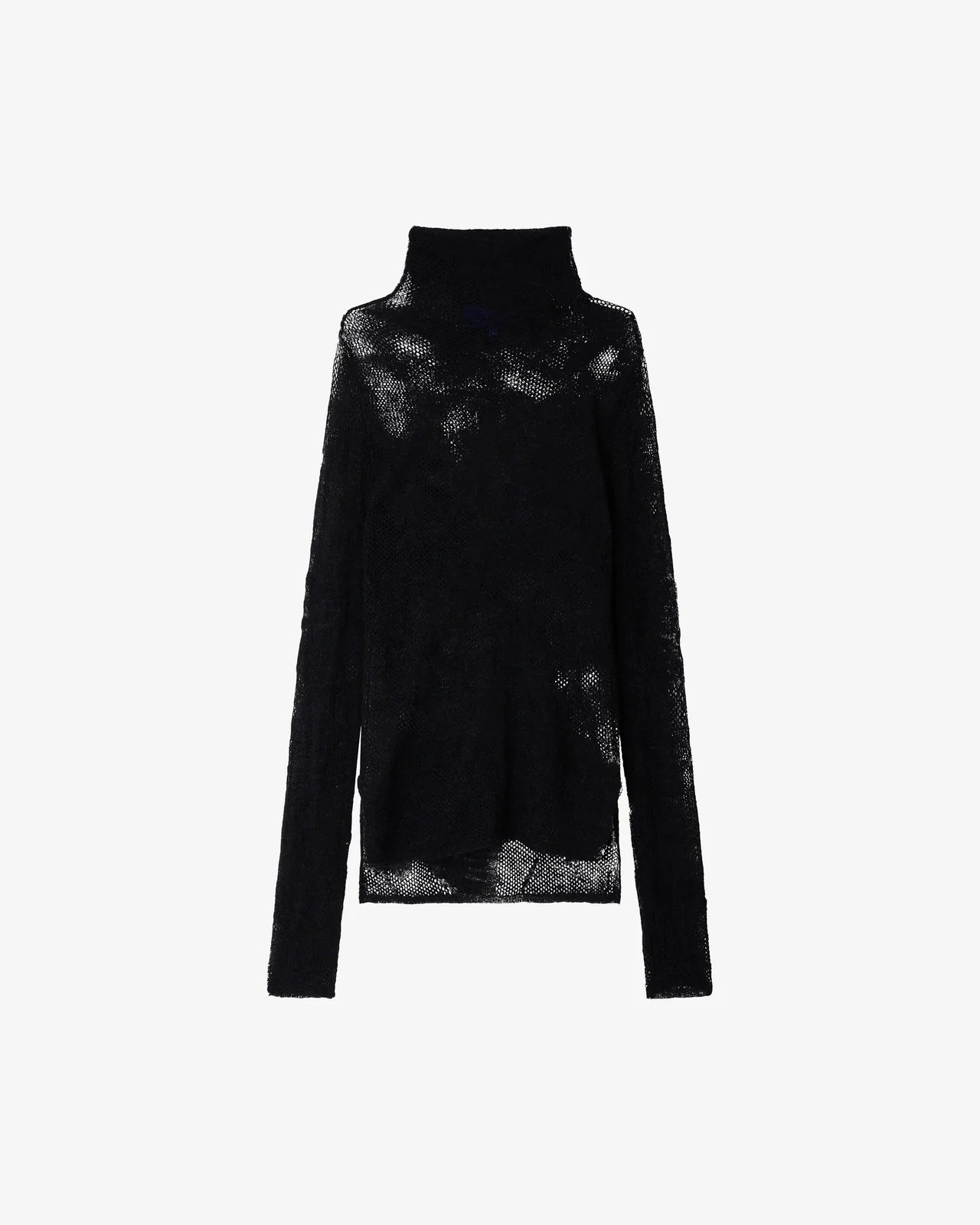 Knitted in a soft and airy alpaca yarn, this black sweater is distinguished by its pointelle texture, worked like lace, revealing a delicate openwork floral pattern. Slightly sheer, it combines lightness and refinement.