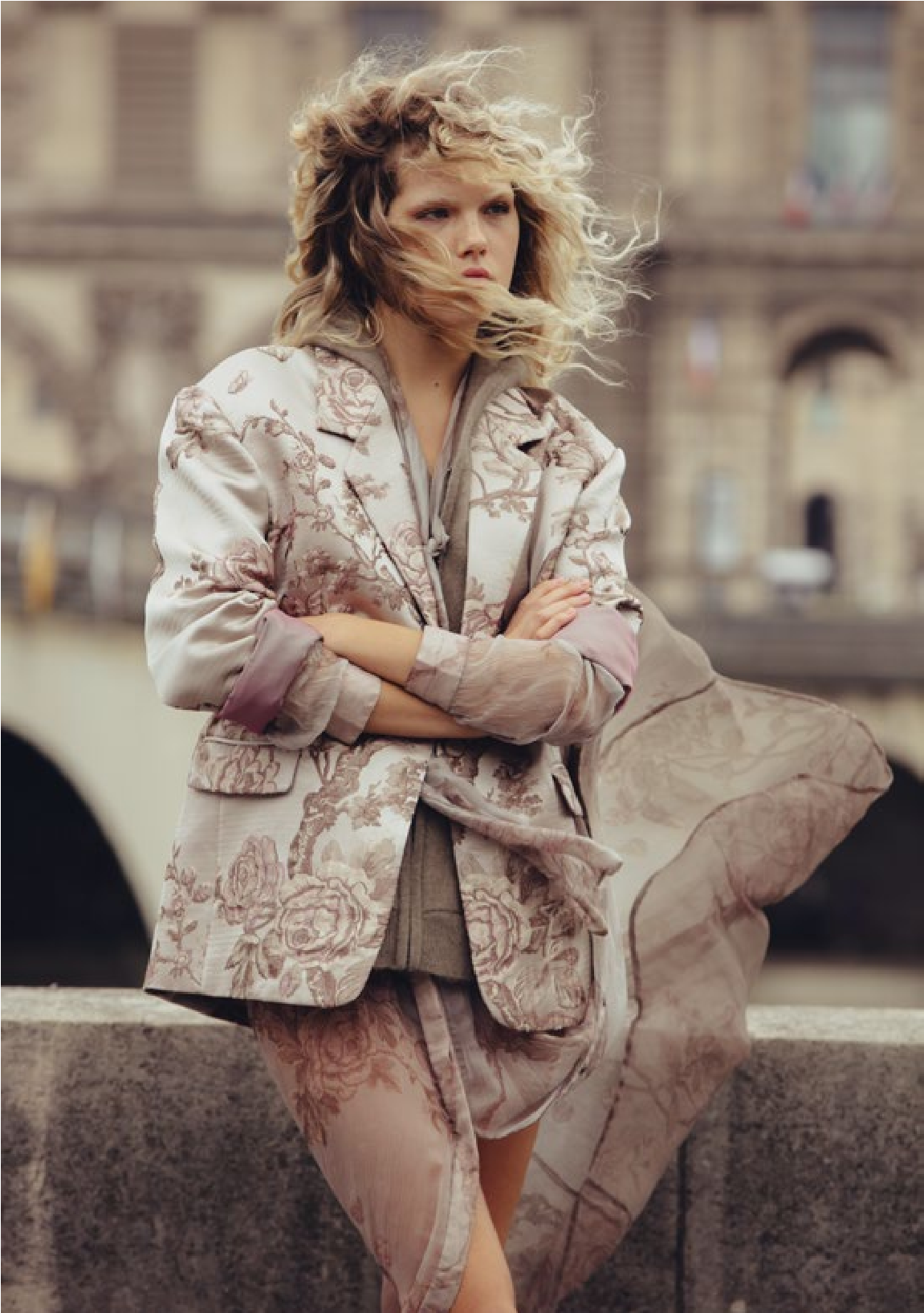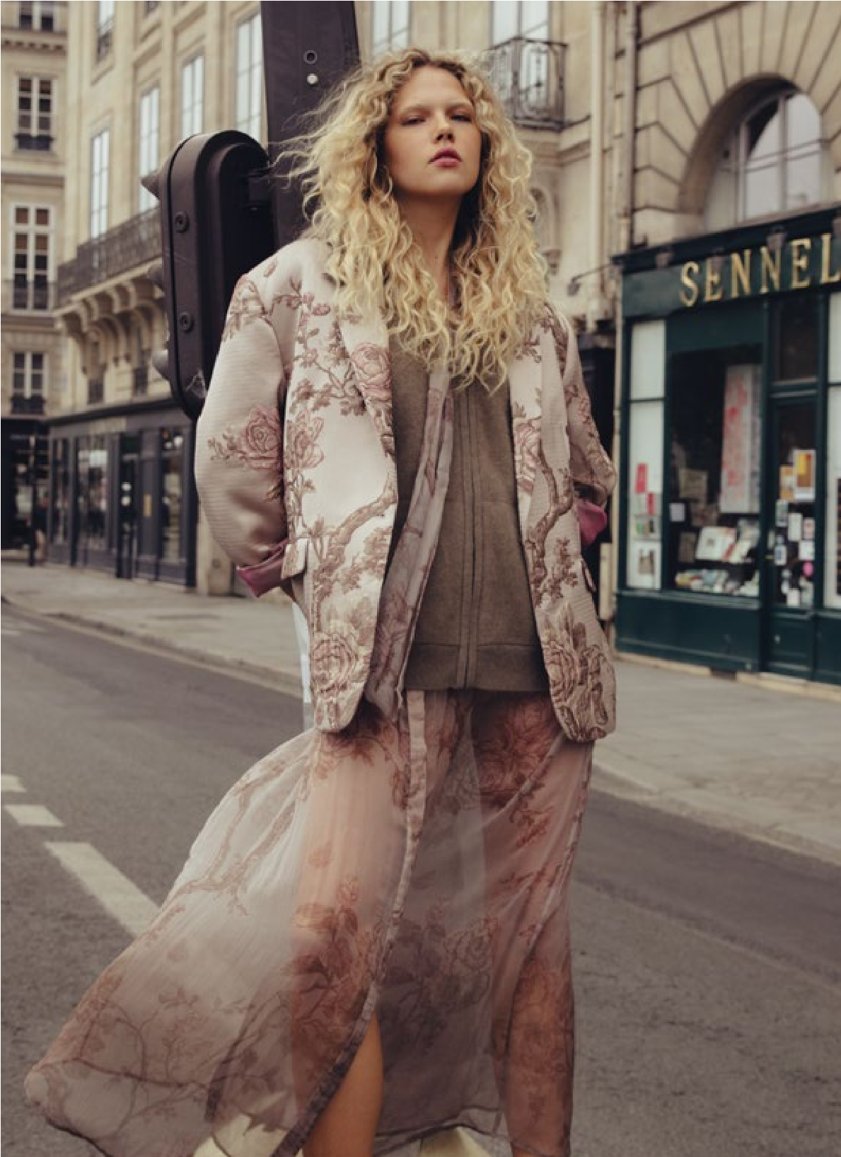 This floral jacket enchants with its soft texture and refined, vintage-inspired pattern.