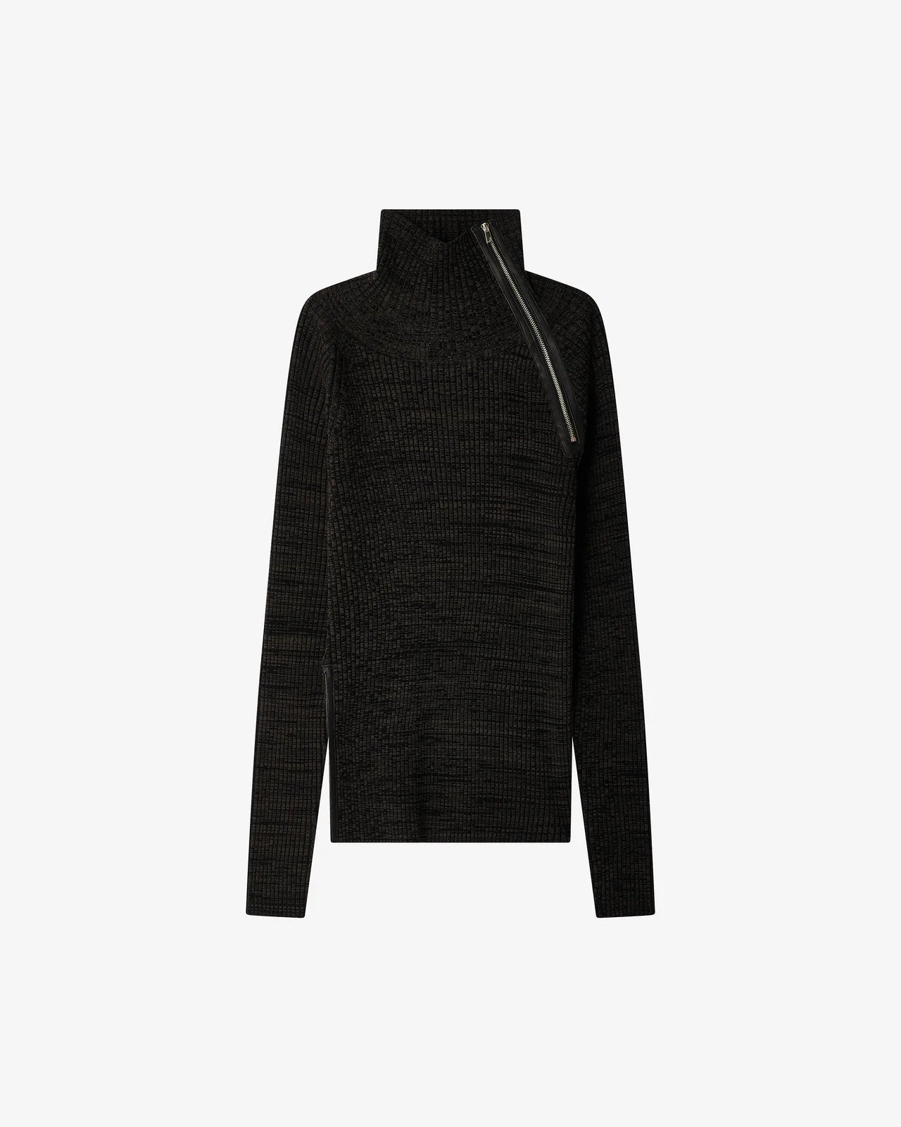Merino wool sweater in ribbed knit, with a straight, close-fitting cut. This model features soft, fine leather trims on the neckline and hem, a side zip opening on the neck and a leather-trimmed side slit. Dark khaki color, elegant and timeless.