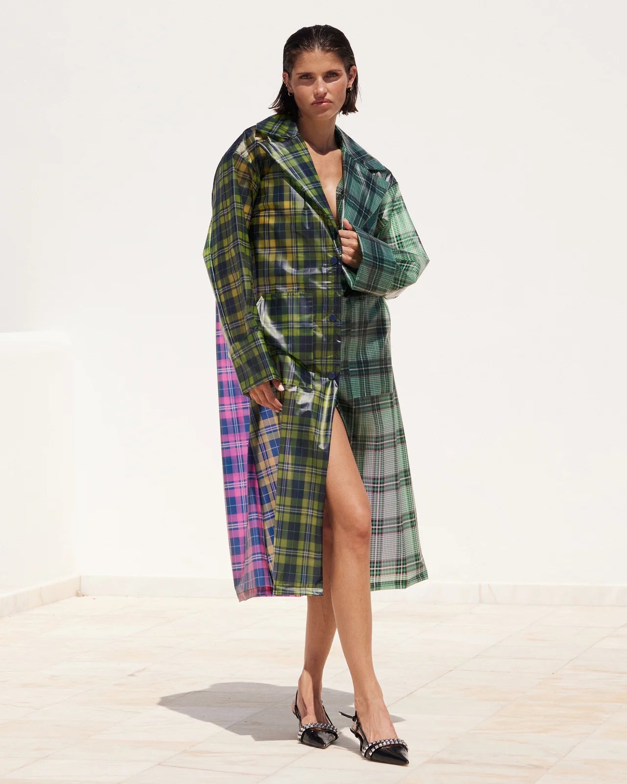 Long raincoat with a tartan print in shades of green and navy. Its straight cut is structured by a tailored neckline and long sleeves, while patch pockets highlight its practical and timeless style.