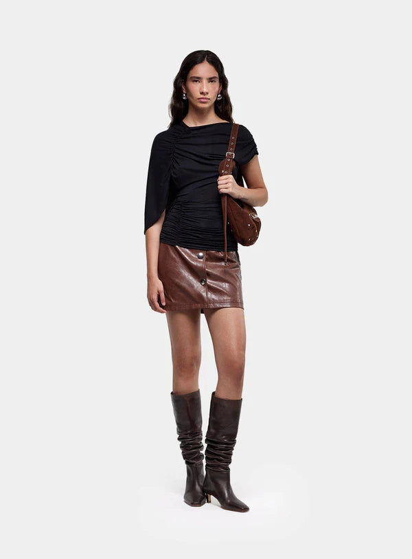 Asymmetric draped top. Fitted silhouette. Draped neckline piece in one side and sleeve piece in the other, from shoulder to back. Open back. Draped waist piece with draped side pieces.