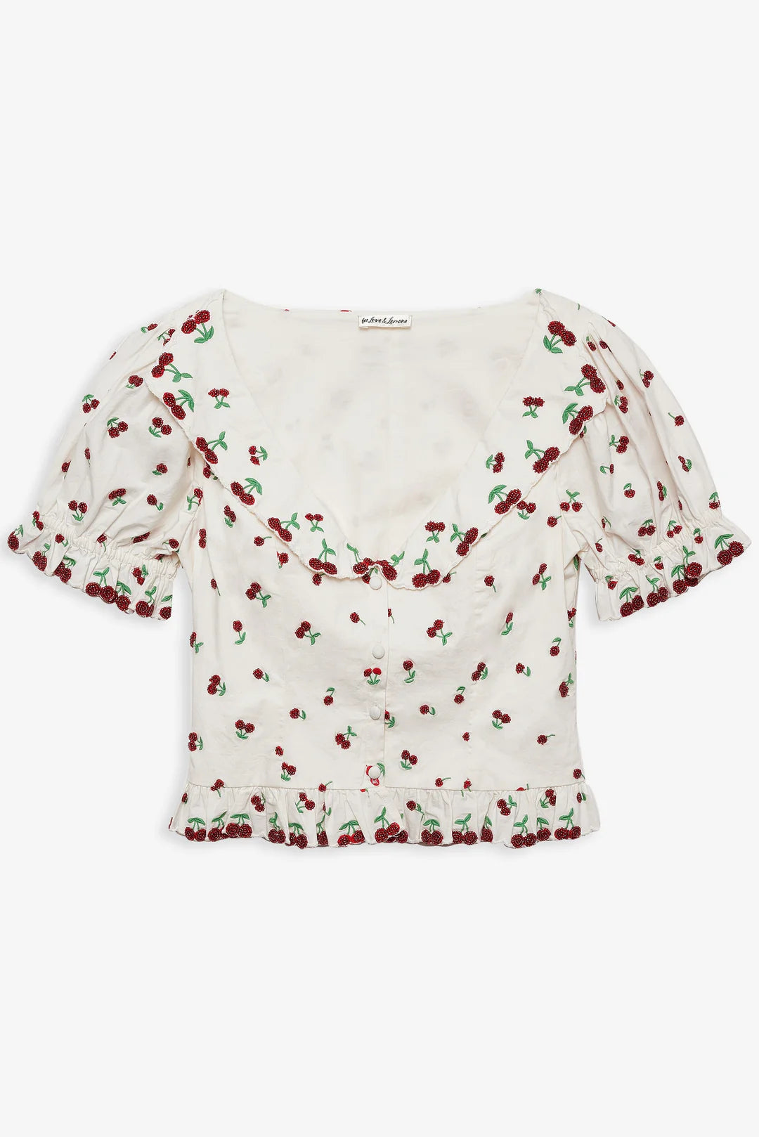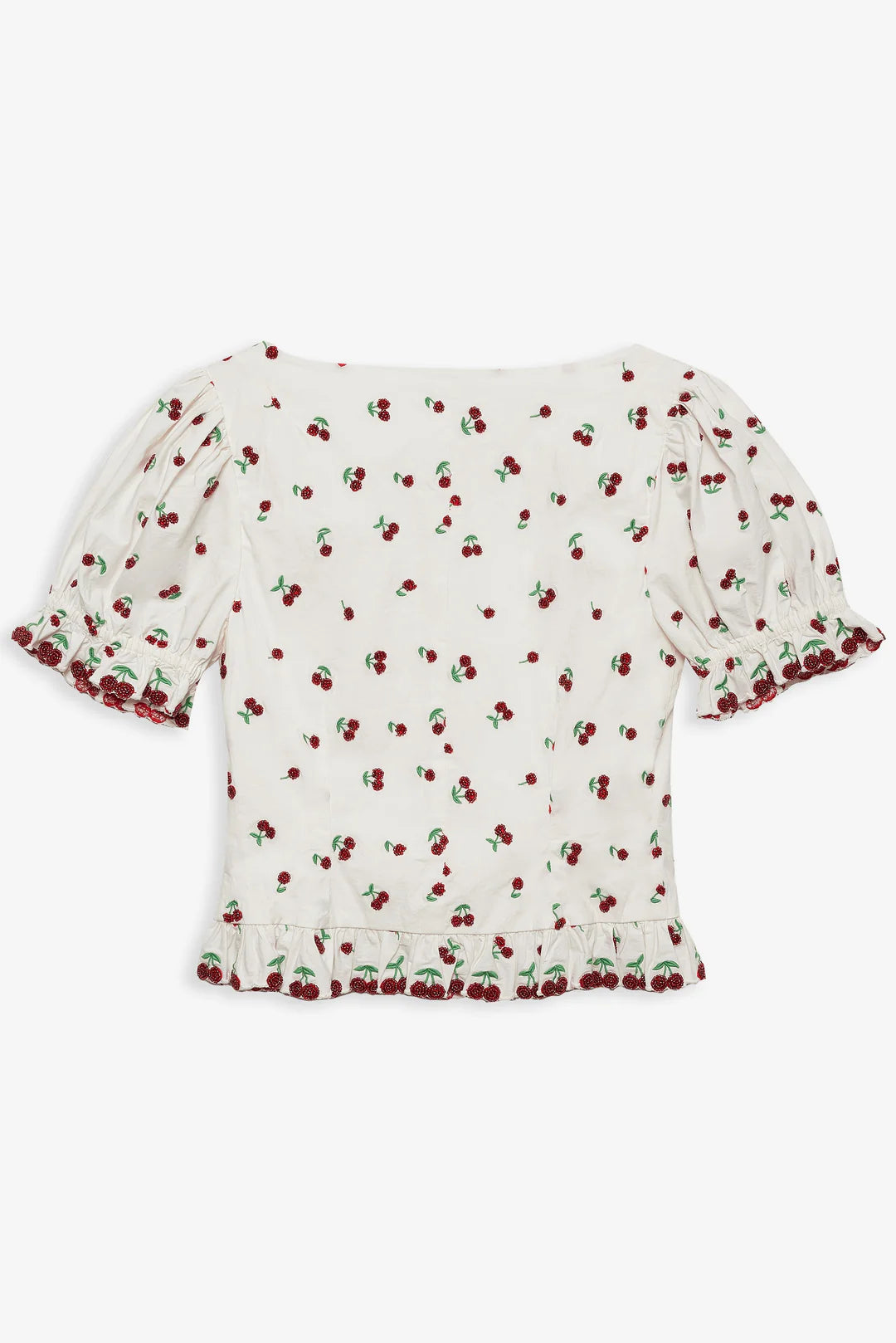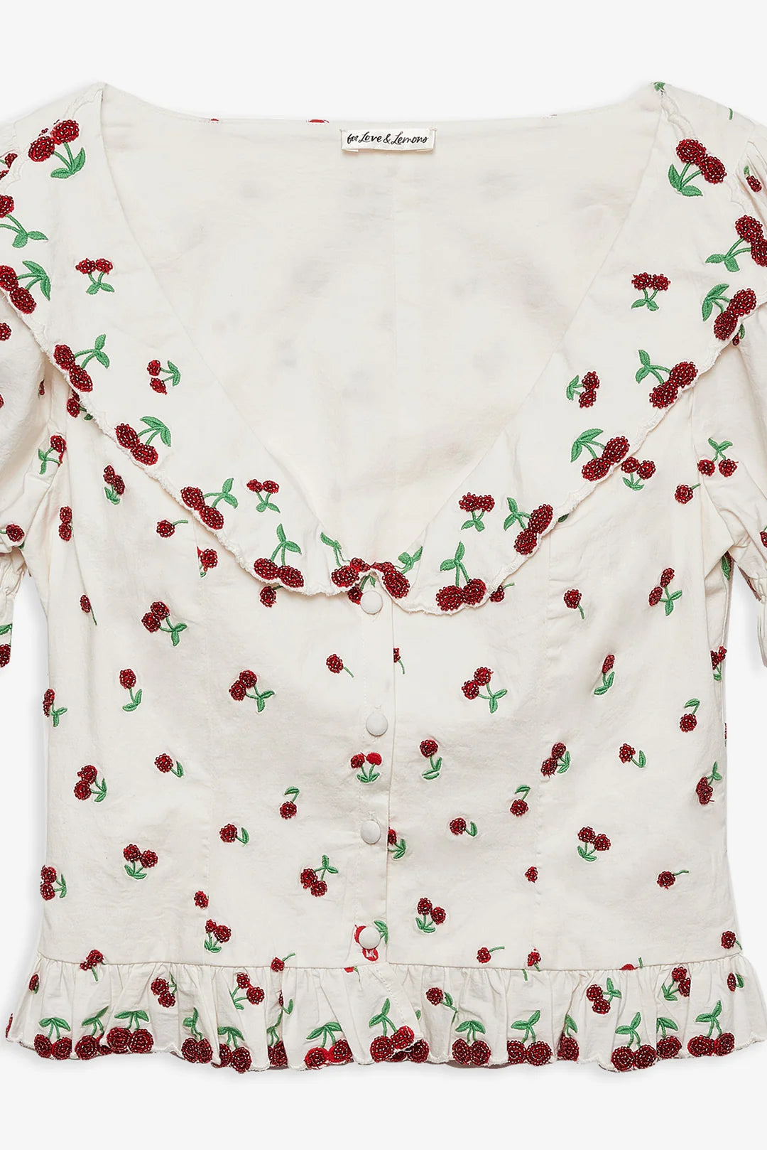 Inspired by iconic vintage silhouettes, the Beaded Cherries white top revives a preppy style of eras past. Crafted in a crisp poplin, this beaded top is adorned with beaded cherry motifs, a sweet peter pan collar, elasticized short puff sleeves, and a functional self covered center front placket.