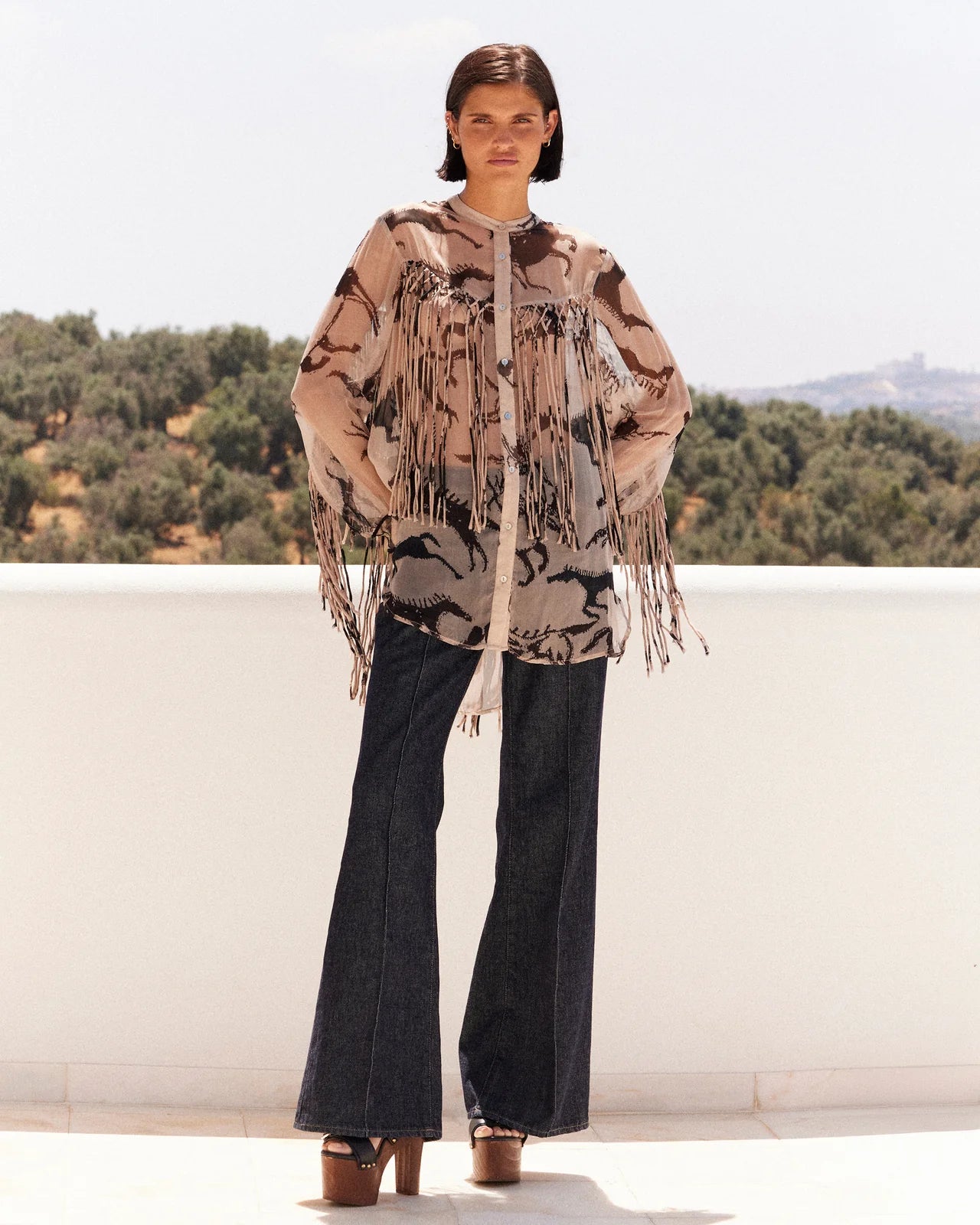 Soft and lightweight viscose chiffon shirt, printed with a prehistoric-inspired pattern in shades of beige and dark brown. The seams and cuffs are trimmed with braided braid for a handcrafted finish. From the chest, intricate cord-like fringes fall down the front, adding texture and movement. A strong and fluid piece with a raw and sophisticated feel.