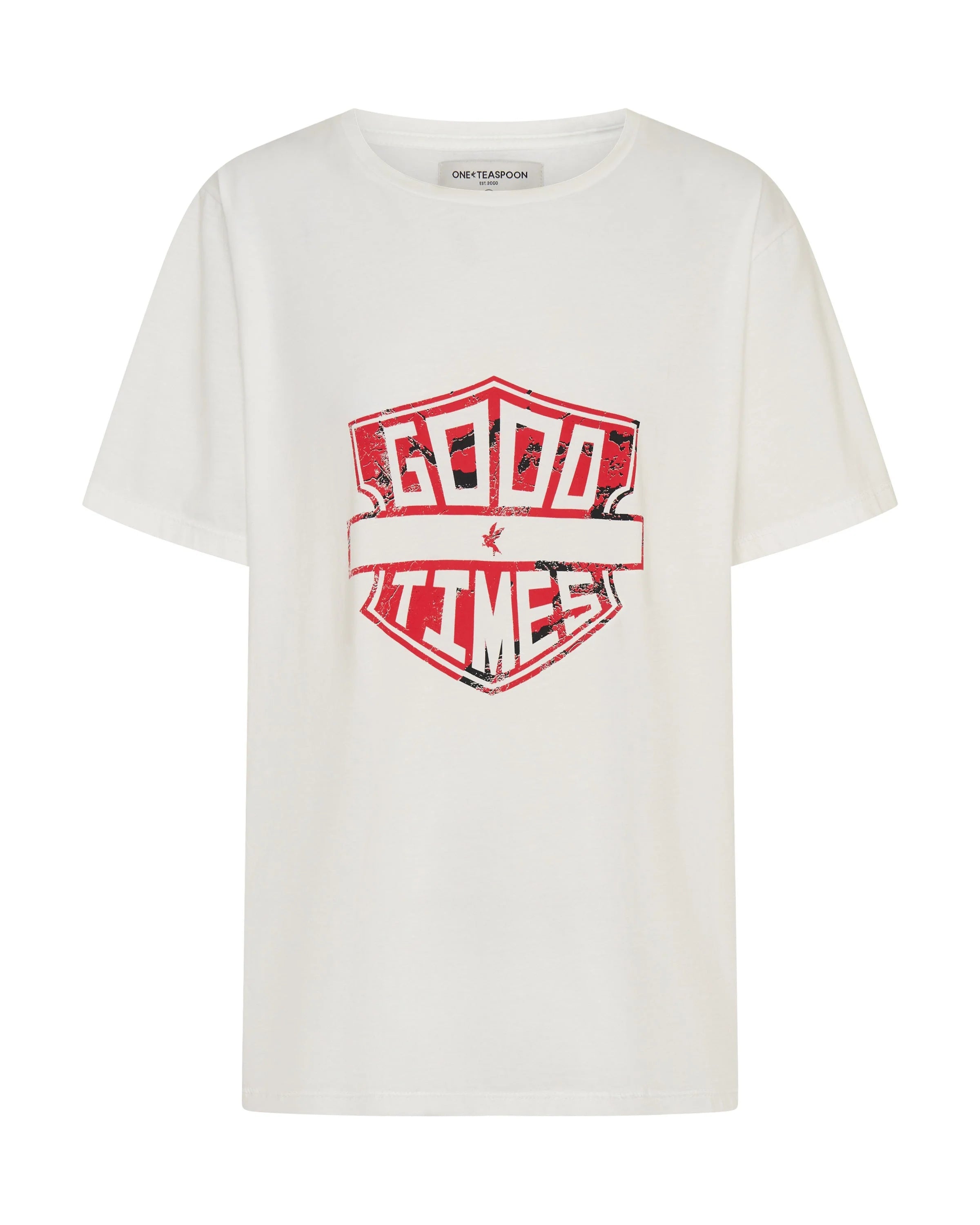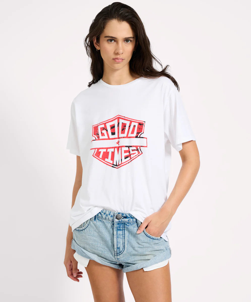 Laid-back and loud in the best way. The WHITE GOOD TIMES BOYFRIEND TEE brings retro energy with a bold red graphic print on a crisp white base. Slightly oversized for that borrowed-from-him feel, it’s an easy staple that’s made for everyday rebellion.