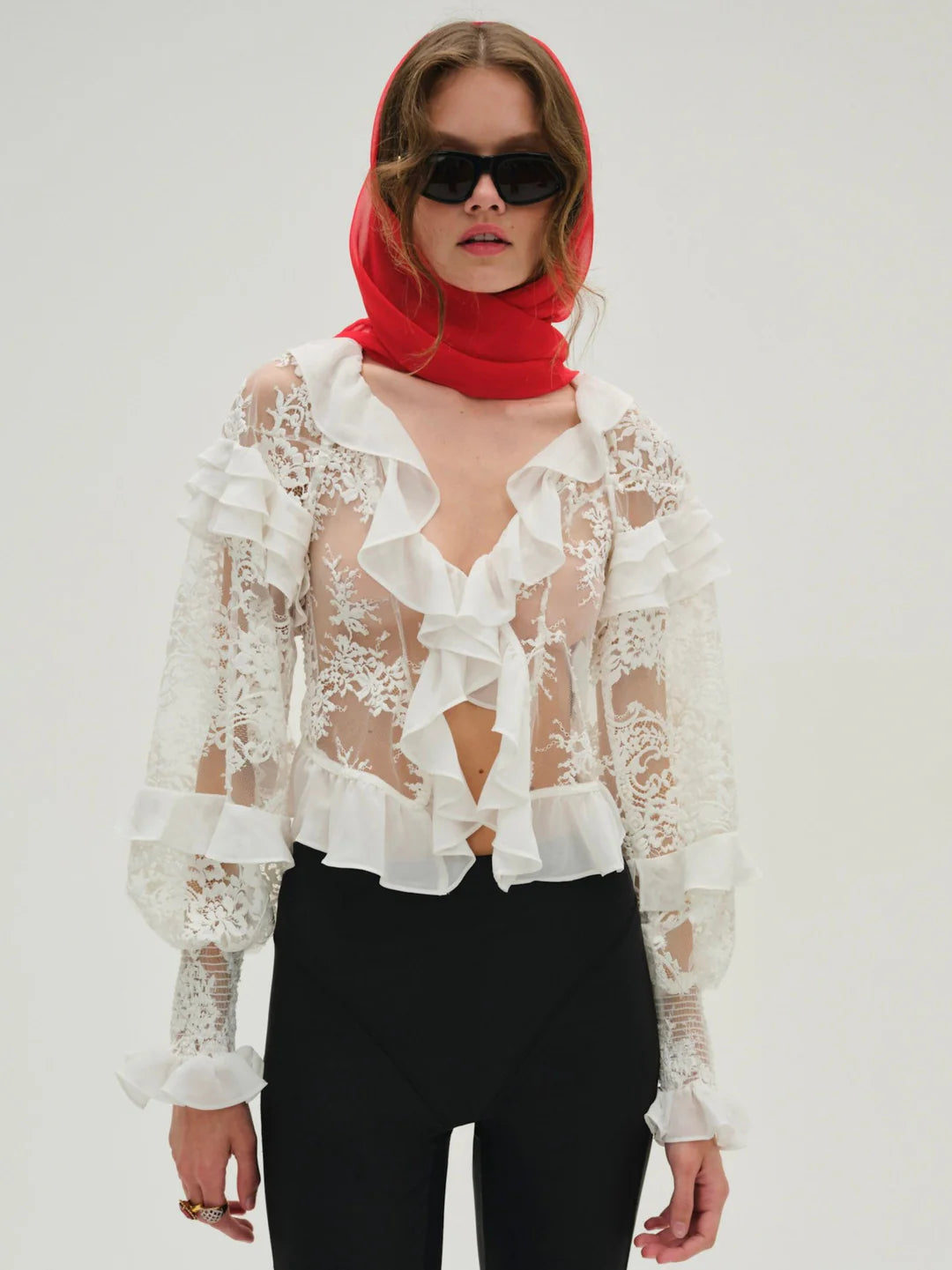 Ultra-feminine and hopelessly romantic, the Holiday white lace blouse has a truly timeless feel. Crafted in sheer lace, this evening top features a plunging neckline, long blouson sleeves, and dramatic chiffon ruffle details.