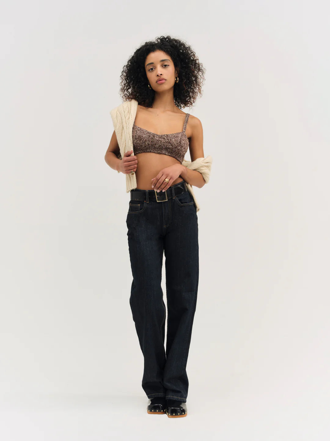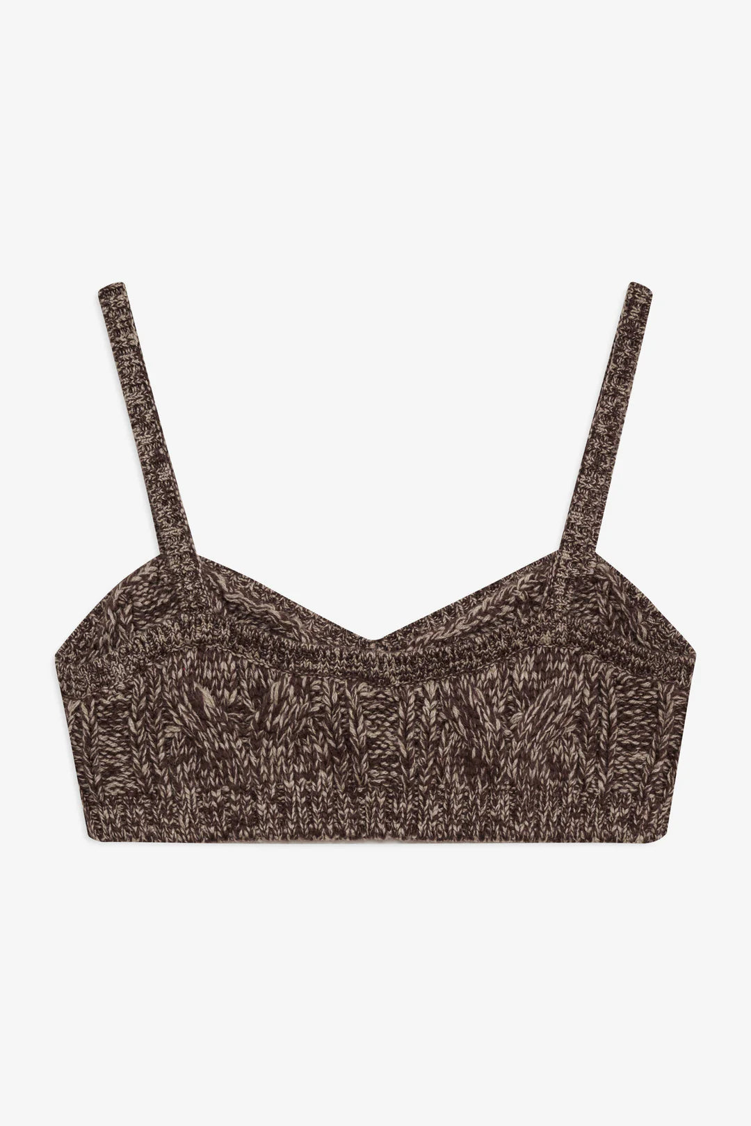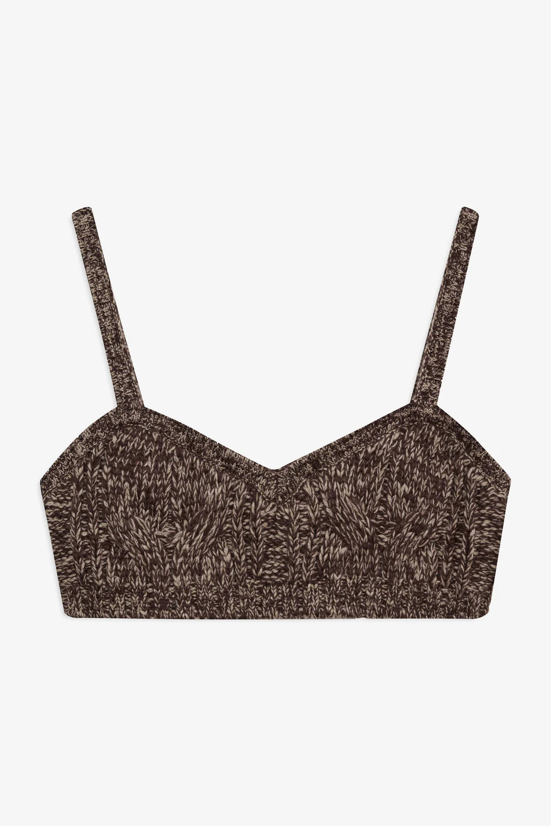 Embrace your soft side with the Nathalie Knit bra top, perfect for your soft afternoon wardrobe. Crafted in a cozy cable knit, this brown bralette is pull-on style and features a “v” neckline.