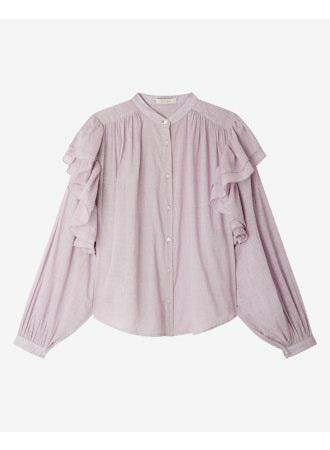 The straight collar frames a discreet front opening, while small ruffles at the top of the sleeves bring a feminine, airy touch.