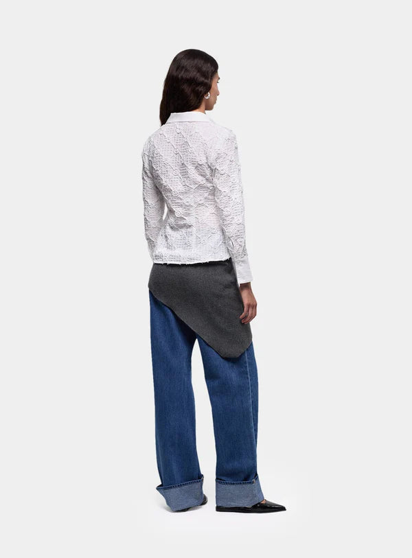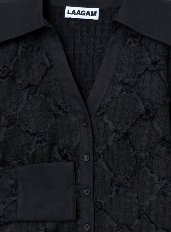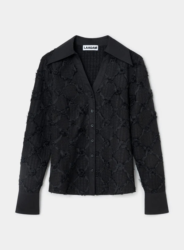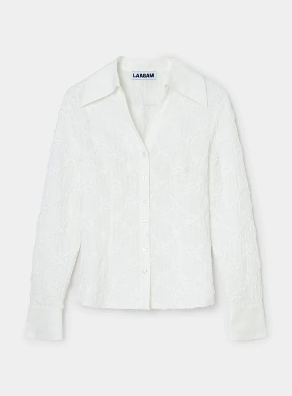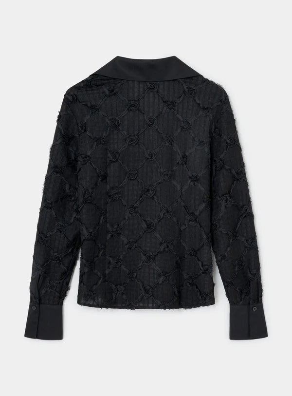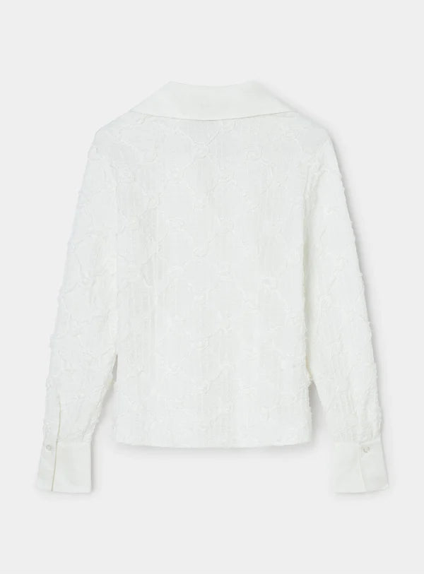 Long sleeve textured blouse. Button-up closure. Collar, front placket and cuffs in plain fabric in contrast.