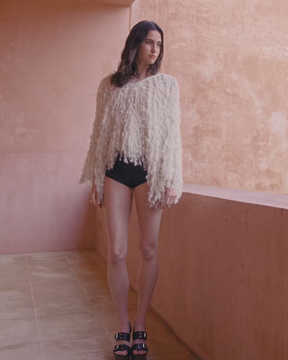 A standout piece of the season, this ivory wool poncho charms with its warm and sophisticated look. Featuring wide sleeves and a relaxed cut, it wraps the silhouette in elegant comfort. The V-neckline enhances the neckline, while carefully placed, hand-applied fringes lend an artisanal, bohemian touch. Its faux fur-effect texture adds unique depth and irresistible softness.