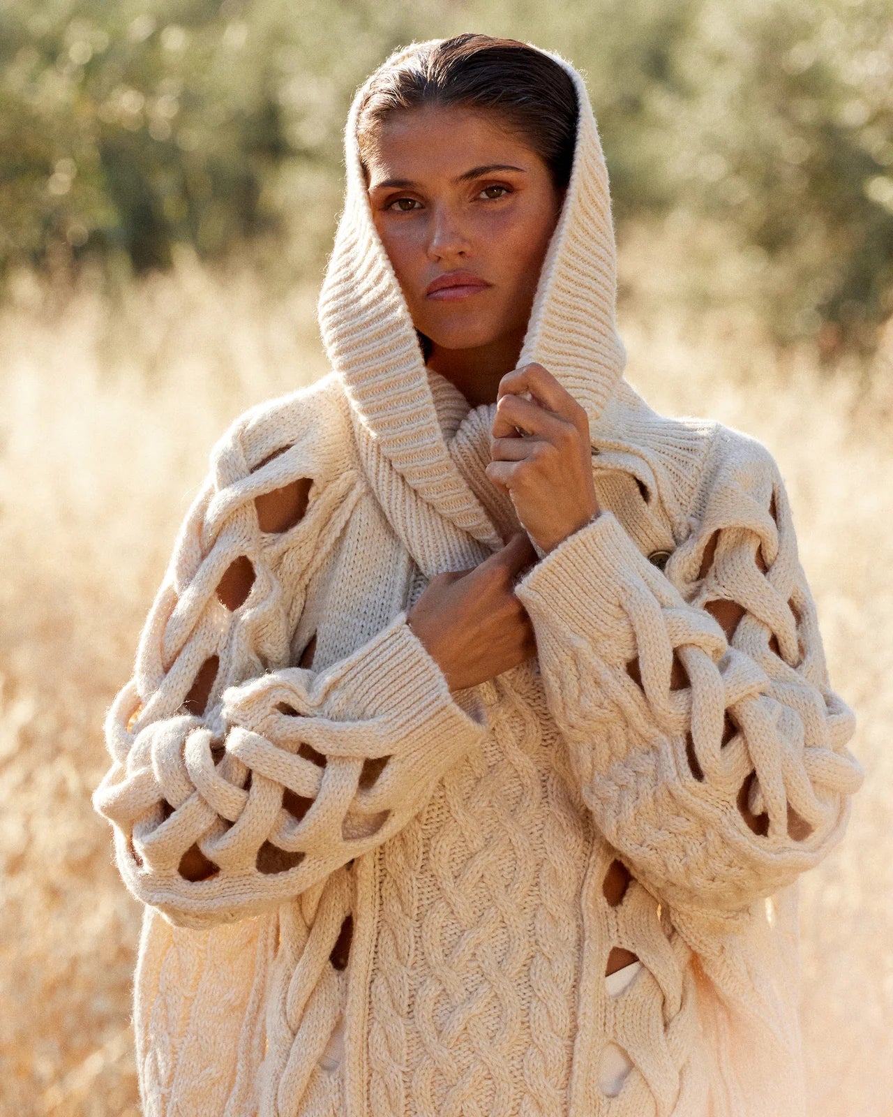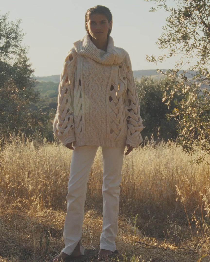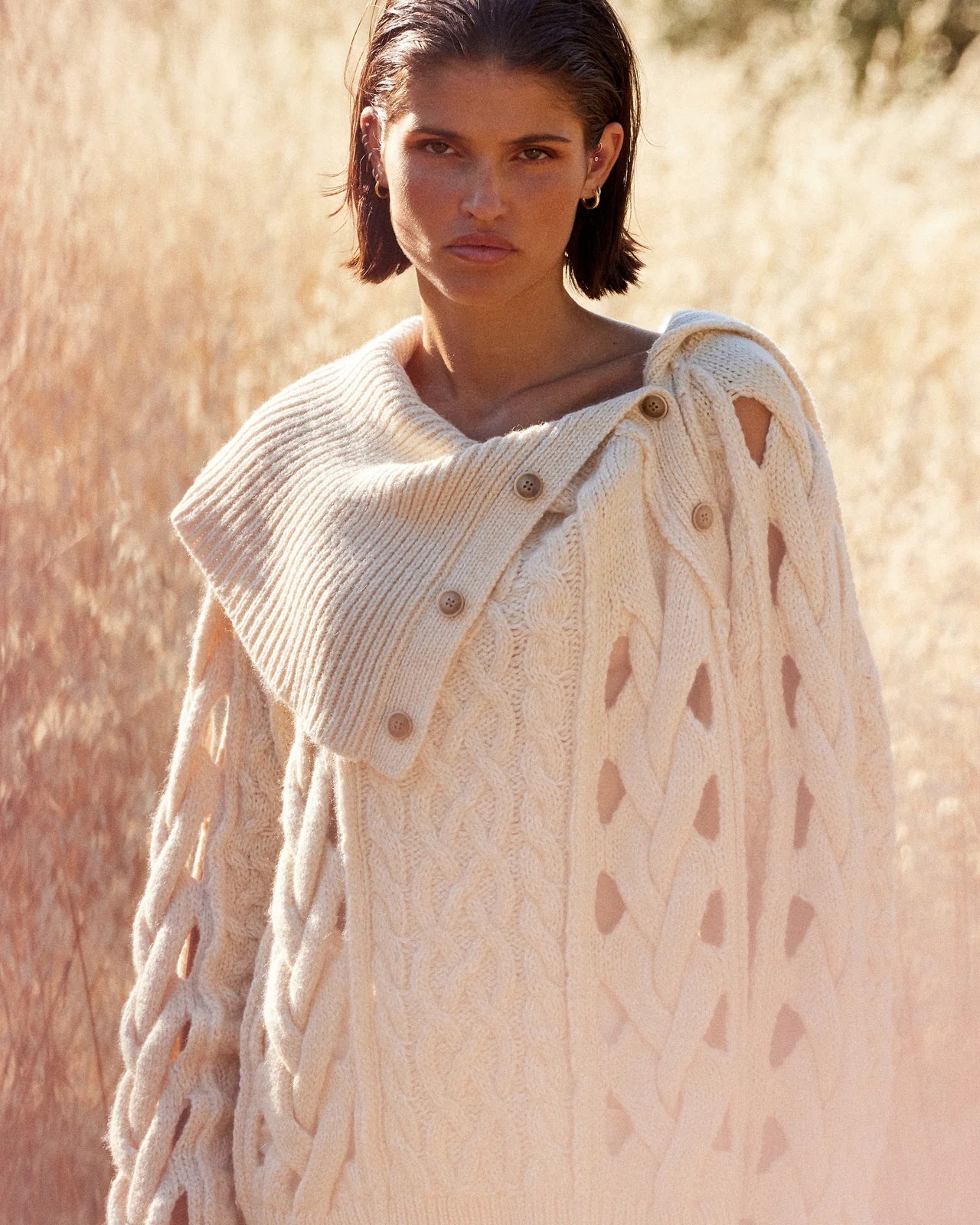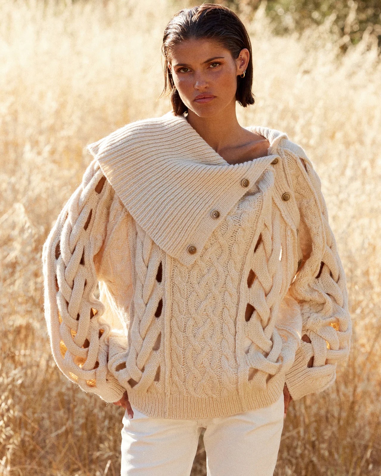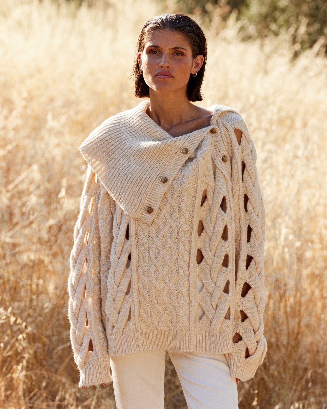 Chunky knit sweater in ecru with a chunky openwork cable pattern for added volume and texture. Raglan sleeves for optimal comfort and a relaxed silhouette. Large button-down collar on the side can be adjusted to delicately reveal one shoulder, adding a subtly sensual touch. Ideal for a cozy yet elegant look.