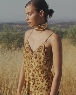 Subtle and feline, this camisole in jacquard viscose plays with the light and contrast of a tone-on-tone panther print.