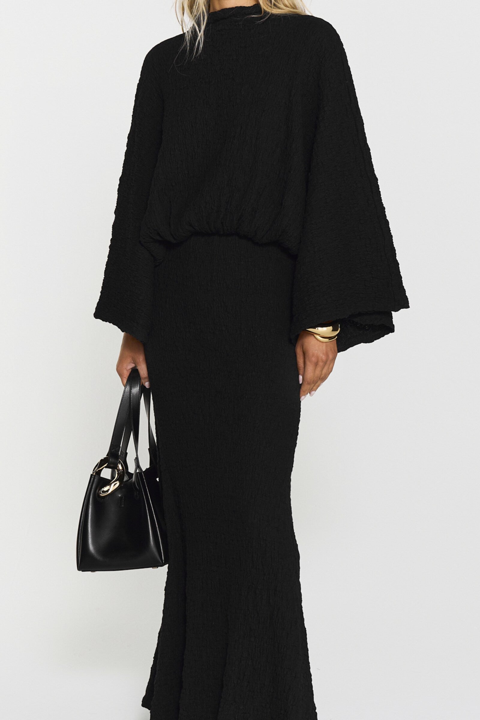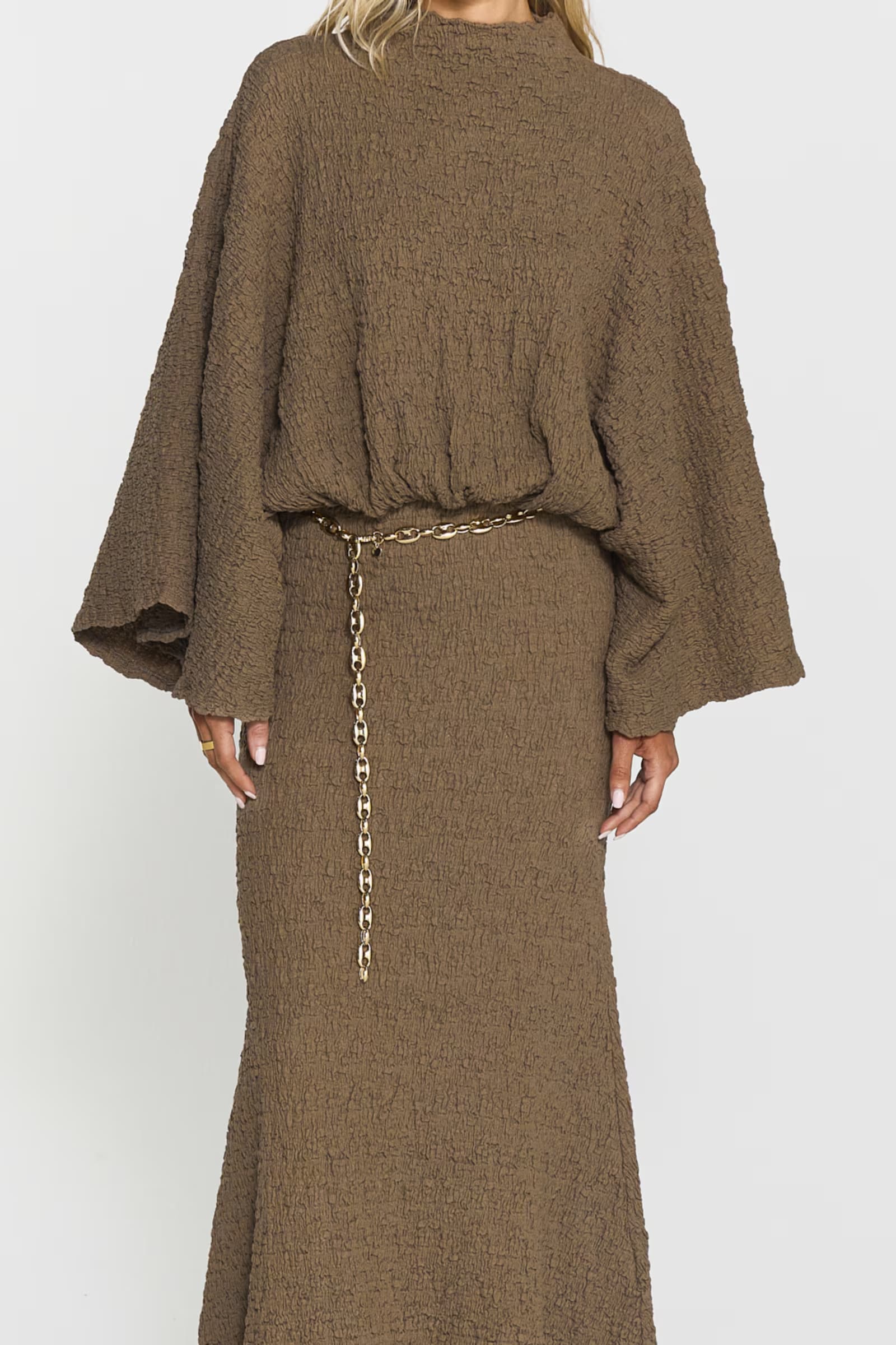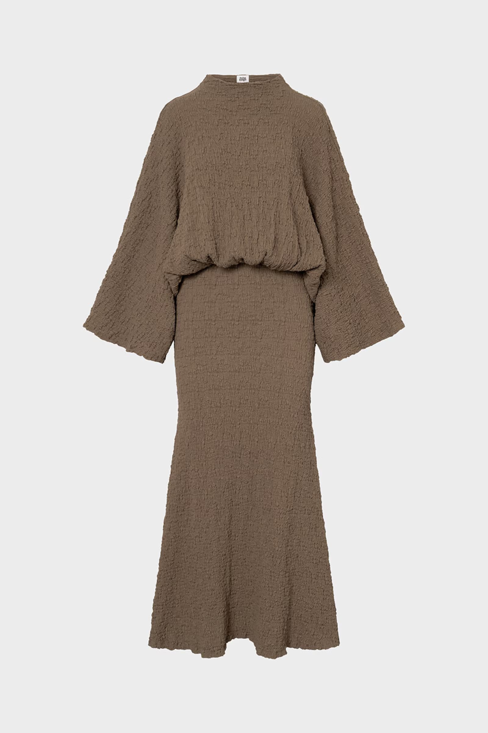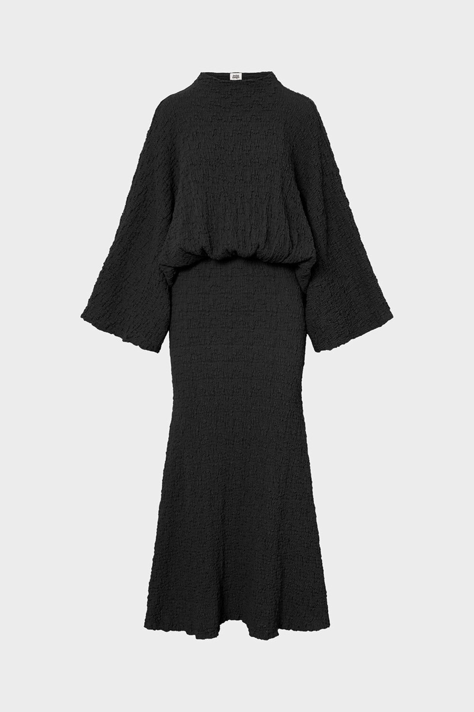 The Izlo Dress features a flattering inserted waist, elegant wide arms and a unique creased texture for a stylish look.