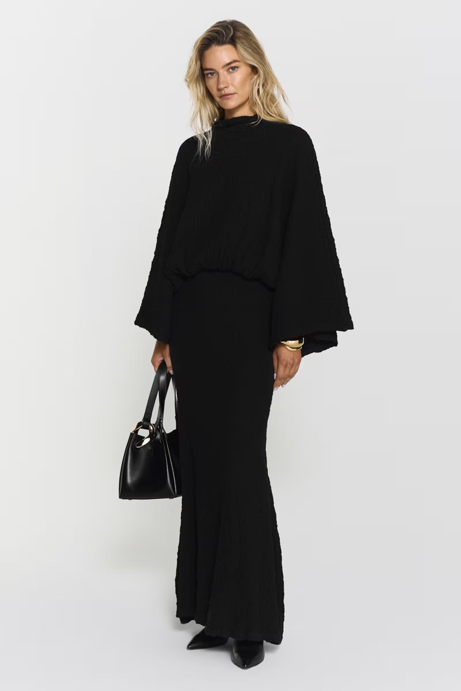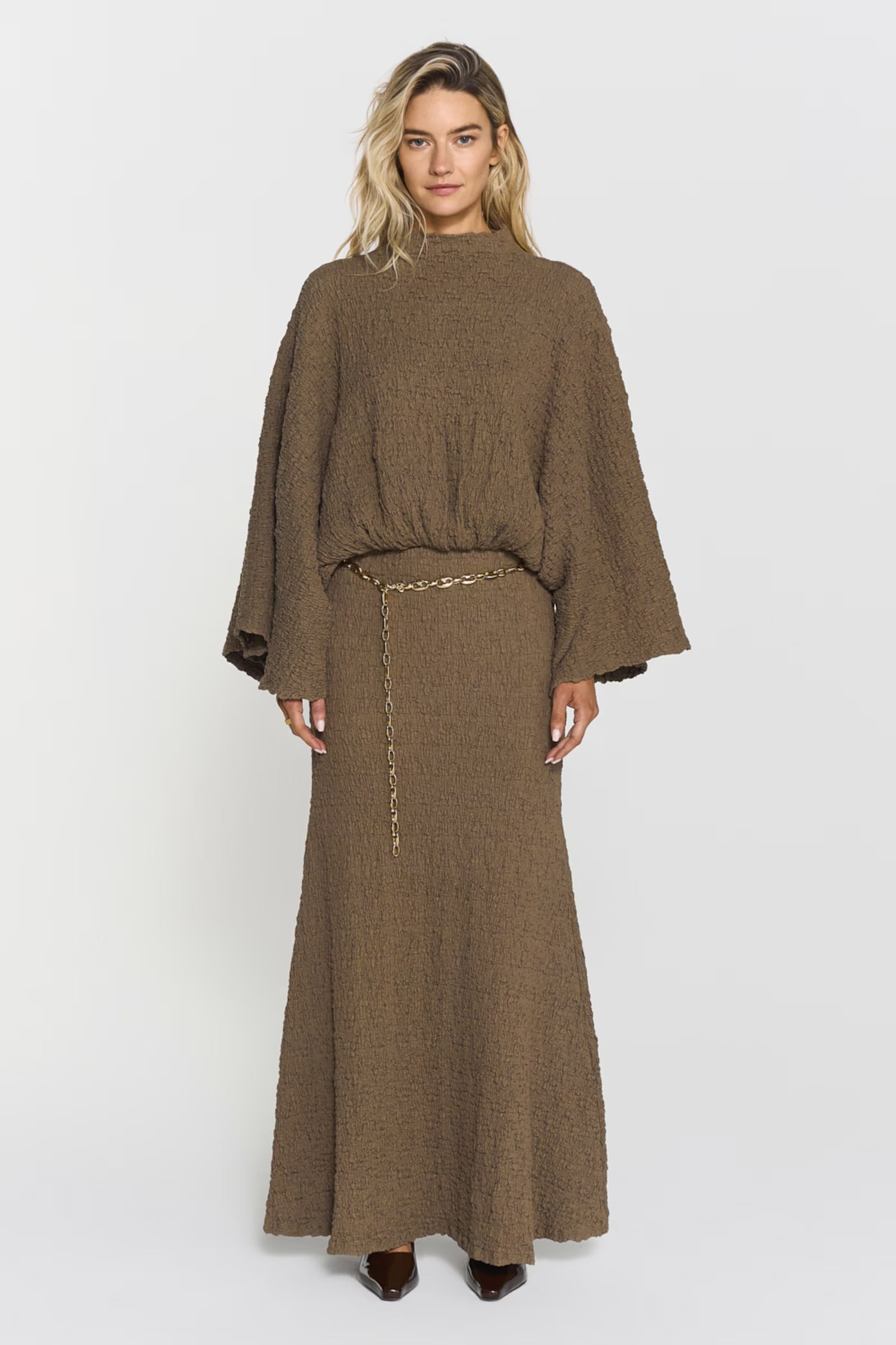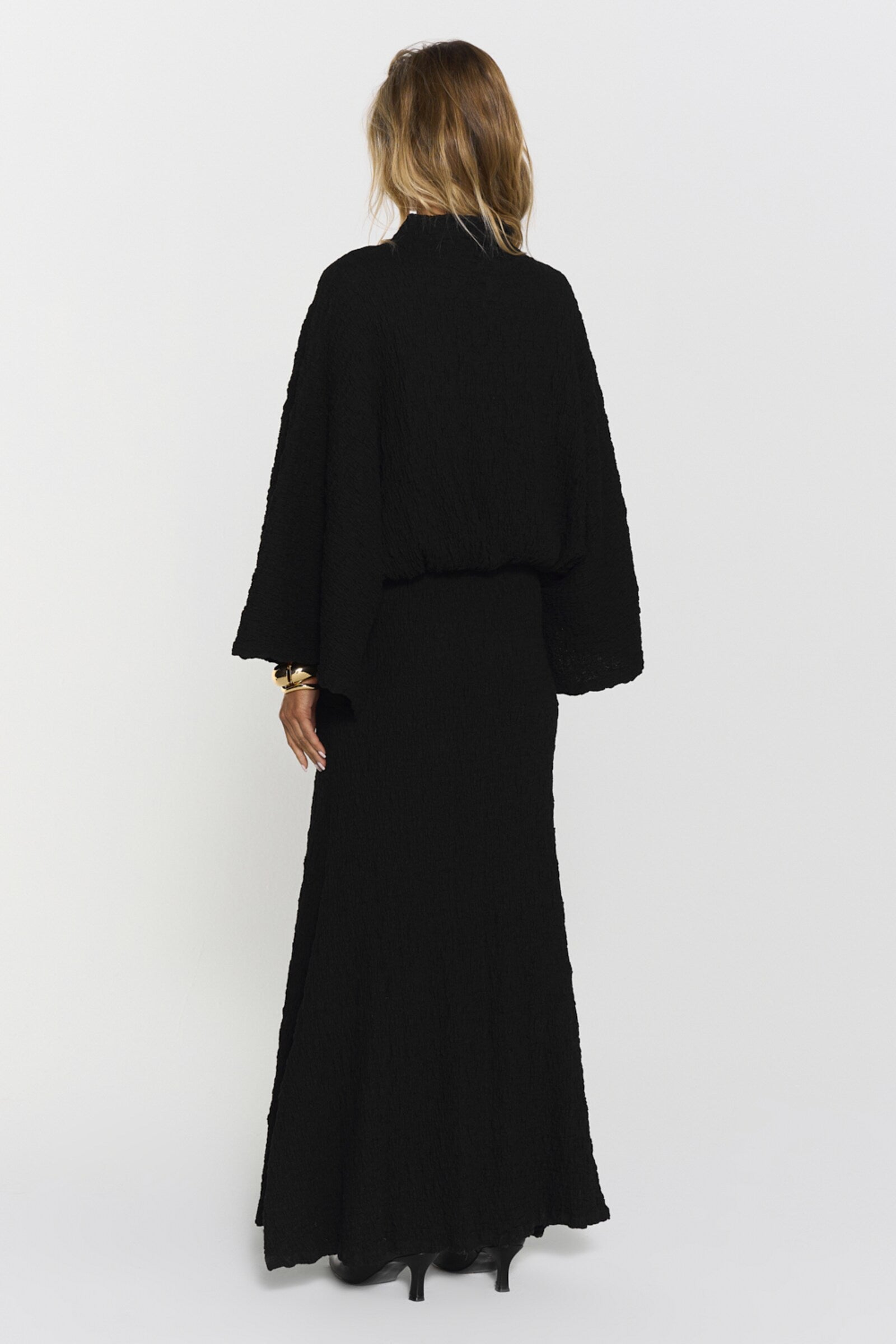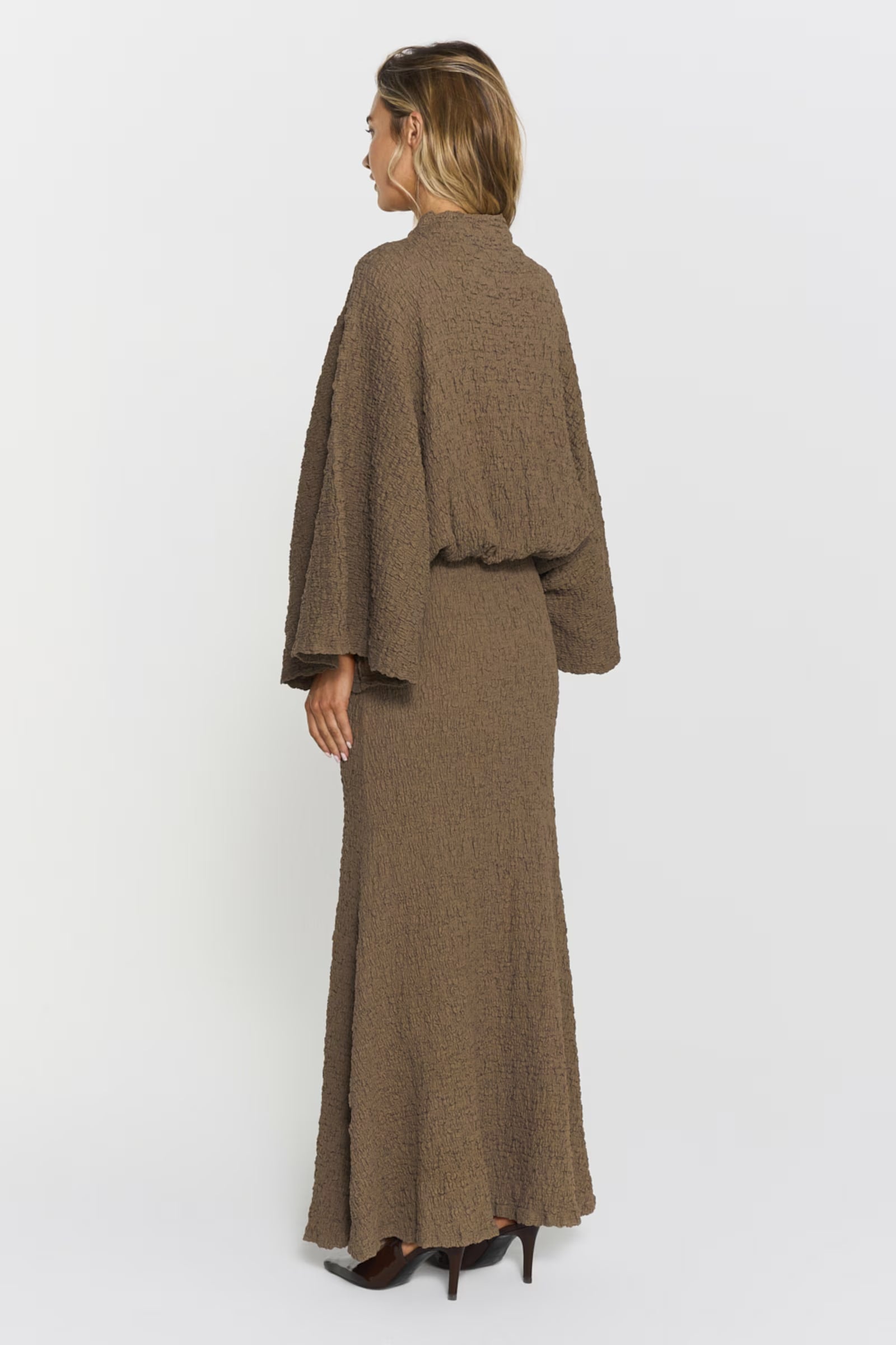 The Izlo Dress features a flattering inserted waist, elegant wide arms and a unique creased texture for a stylish look.
