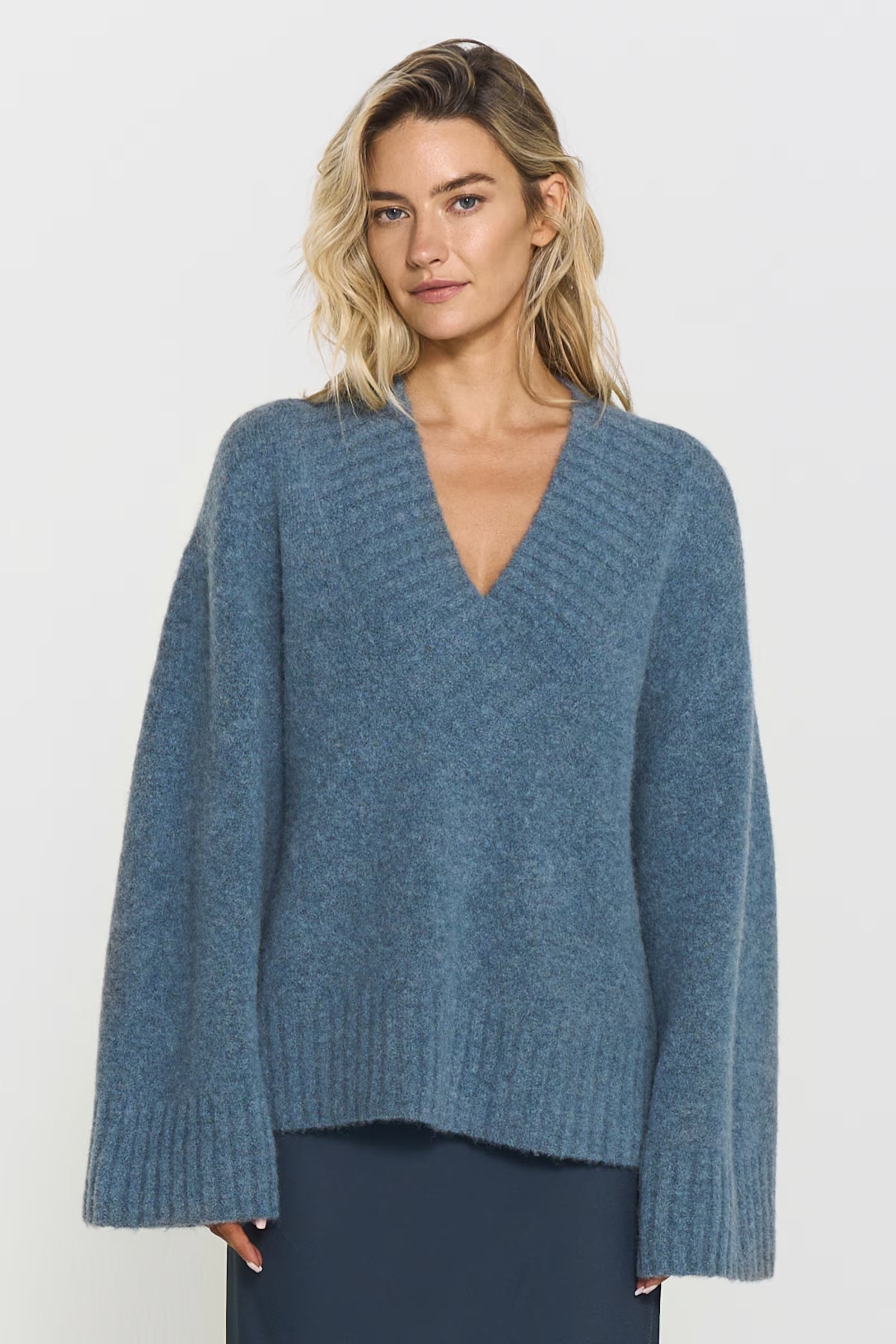 The Saoirse Knitted Sweater, crafted from a soft baby alpaca blend, features a deep V-neckline with a stylish ribbed detail.