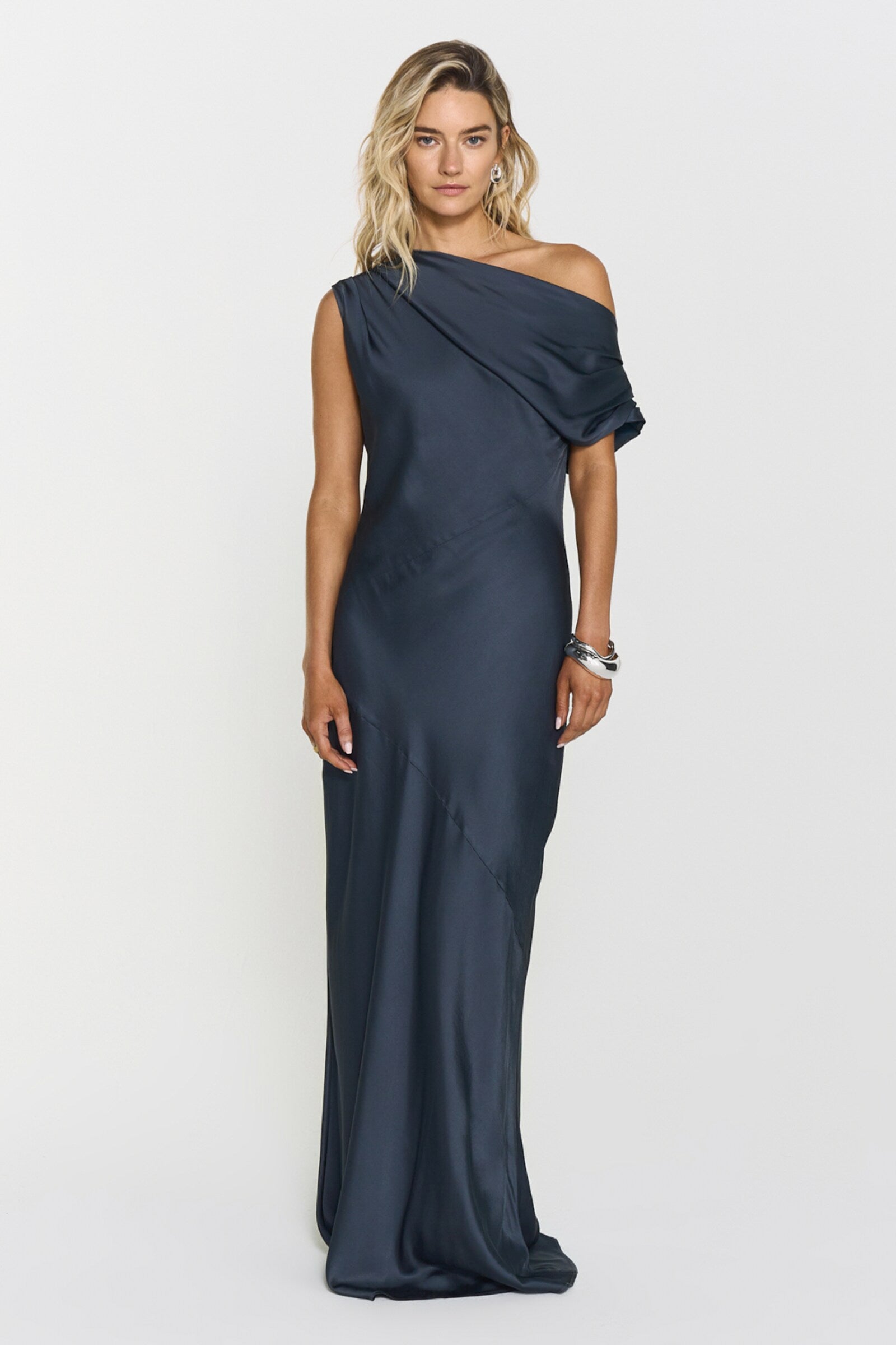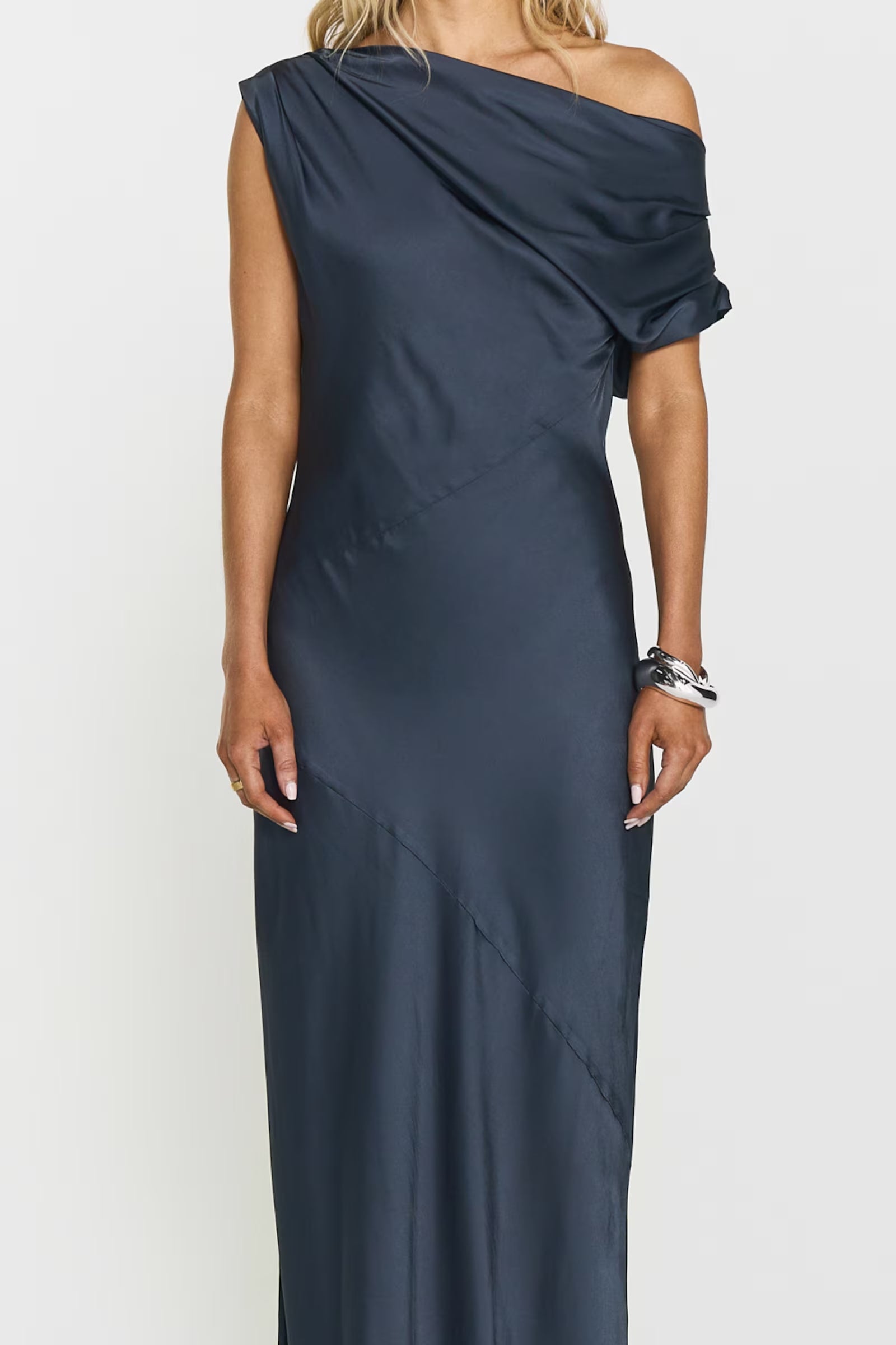 The Vanessa Satin Dress features a luxurious satin fabric, elegant cowl neckline, and flattering bias cut. Its maxi length creates a timeless silhouette, perfect for any festivities.