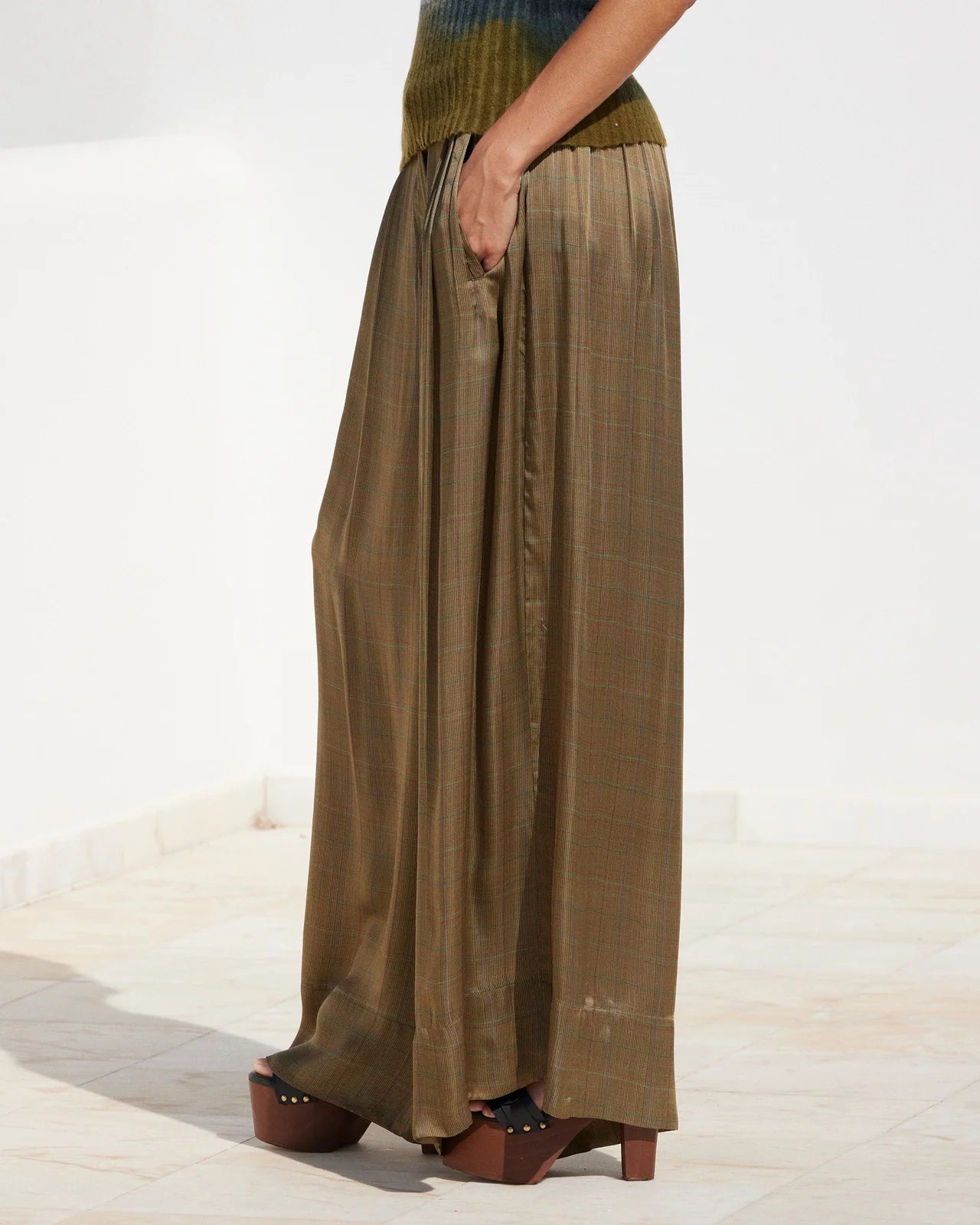 Soft viscose satin trousers, enhanced by an elegant English check print in khaki tones. Their generous volume flares out from the waistband, creating a distinctly masculine look. Discreet side pockets complete this style with a fluid and refined drape.